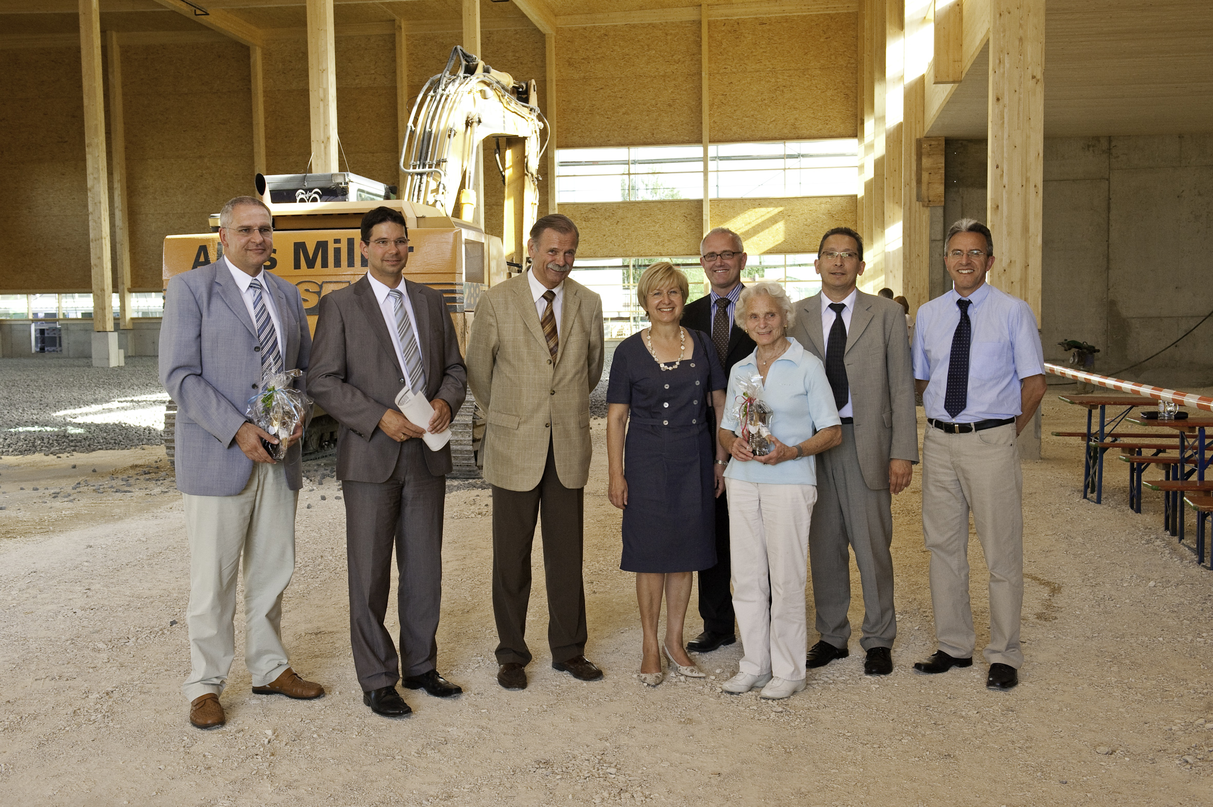 Die Geschäftsleitung der Firma Grünbeck im neuen Logistikzentrum (von links nach rechts): Dr. Günter Stoll, Peter Lachenmeir, Walter Ernst, Bürgermeisterin Hildegard Wanner, Edwin Bauermann-Roos, Loni Grünbeck, Hans Willbold, Jürgen Gollmer