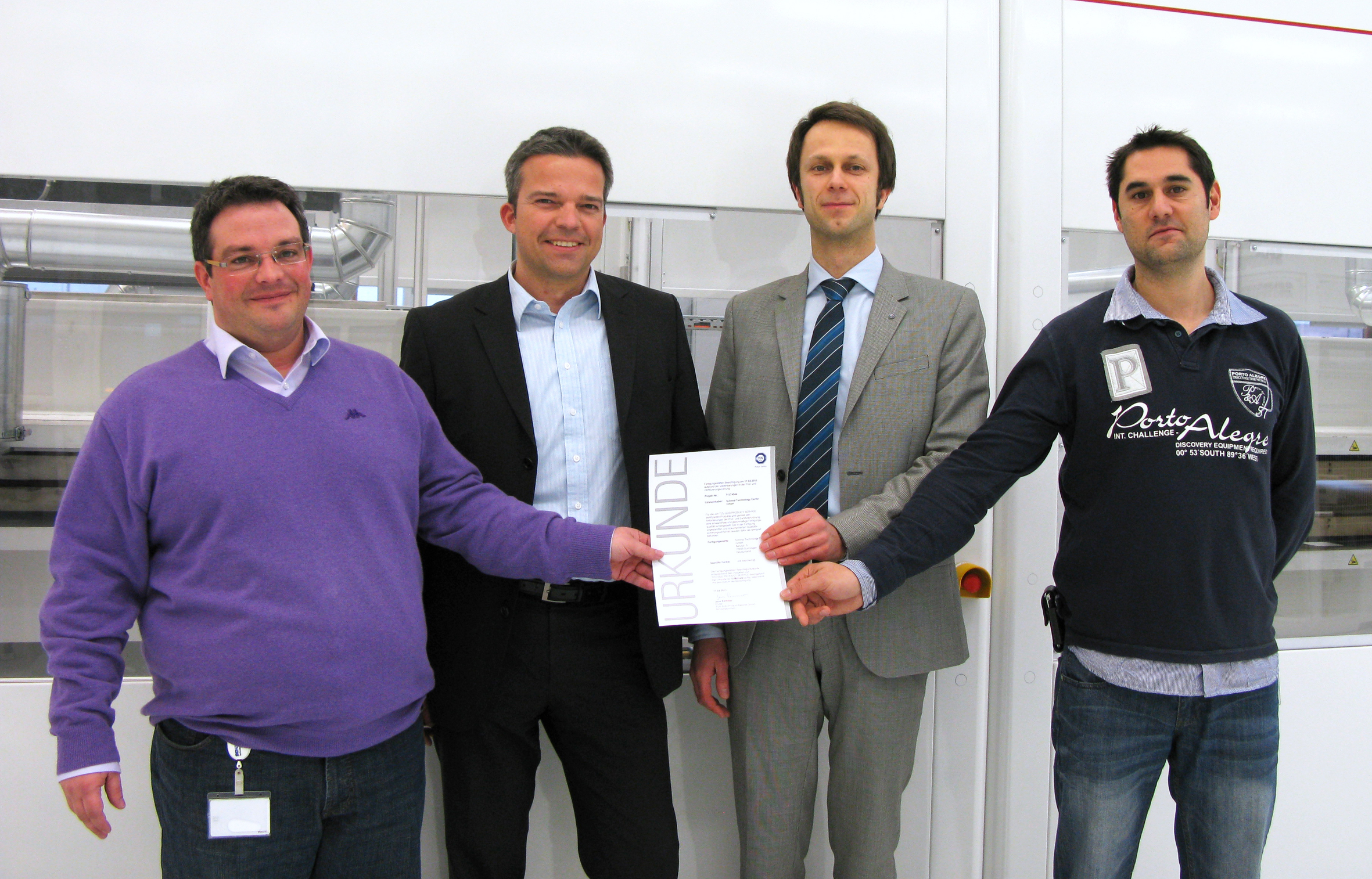 Giovanni-Heinz Pitino – Vice President Operations – (left) and Sascha Bender – Area Manager PV Module – (right) receive the certification document from TÜV employees