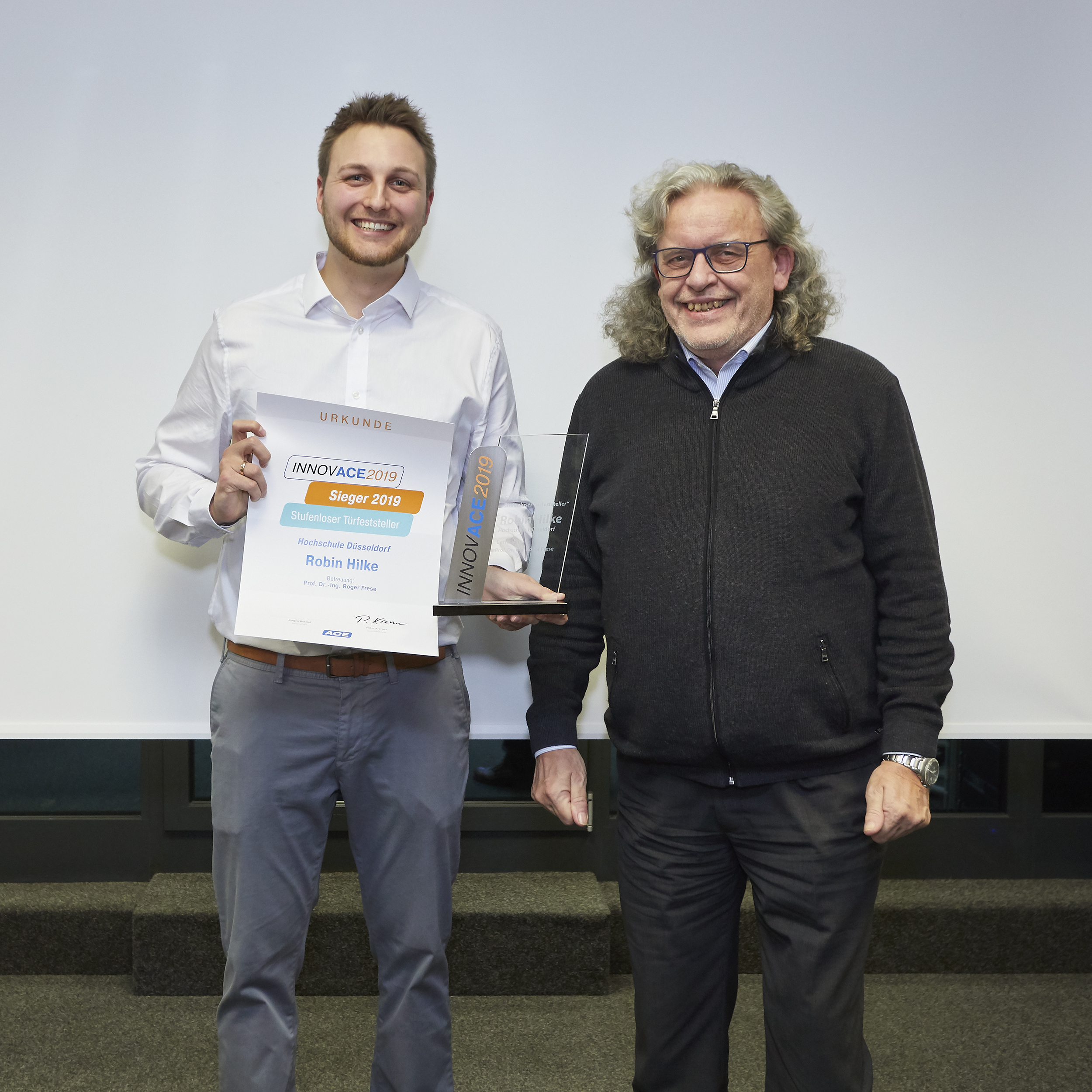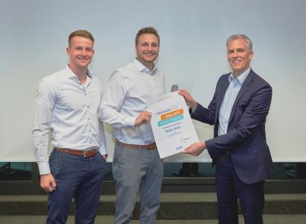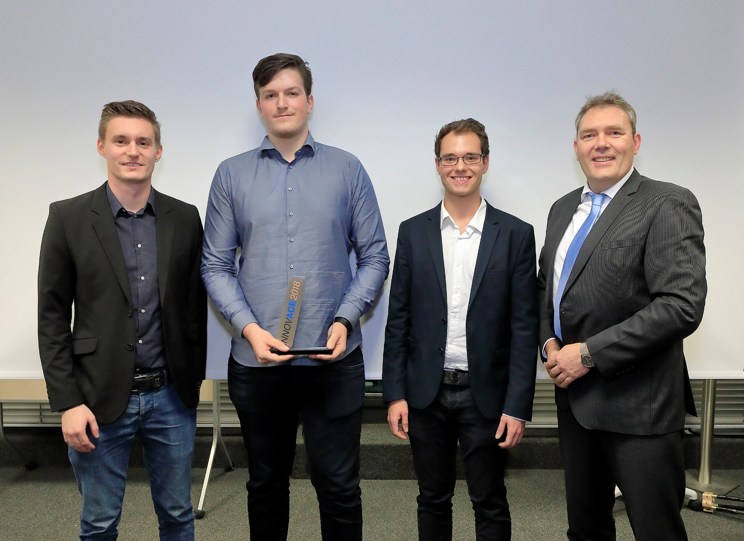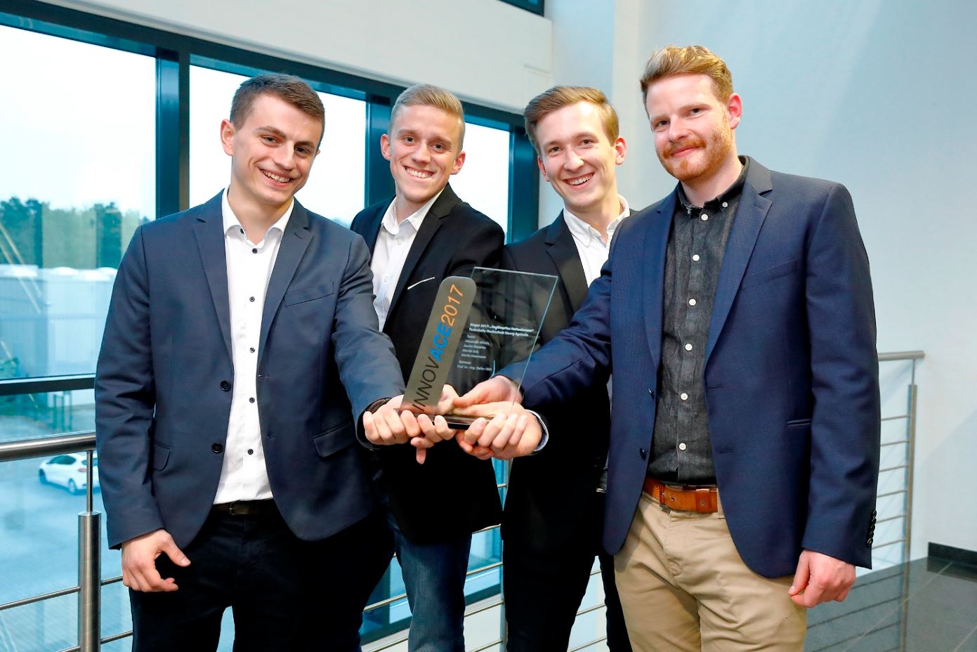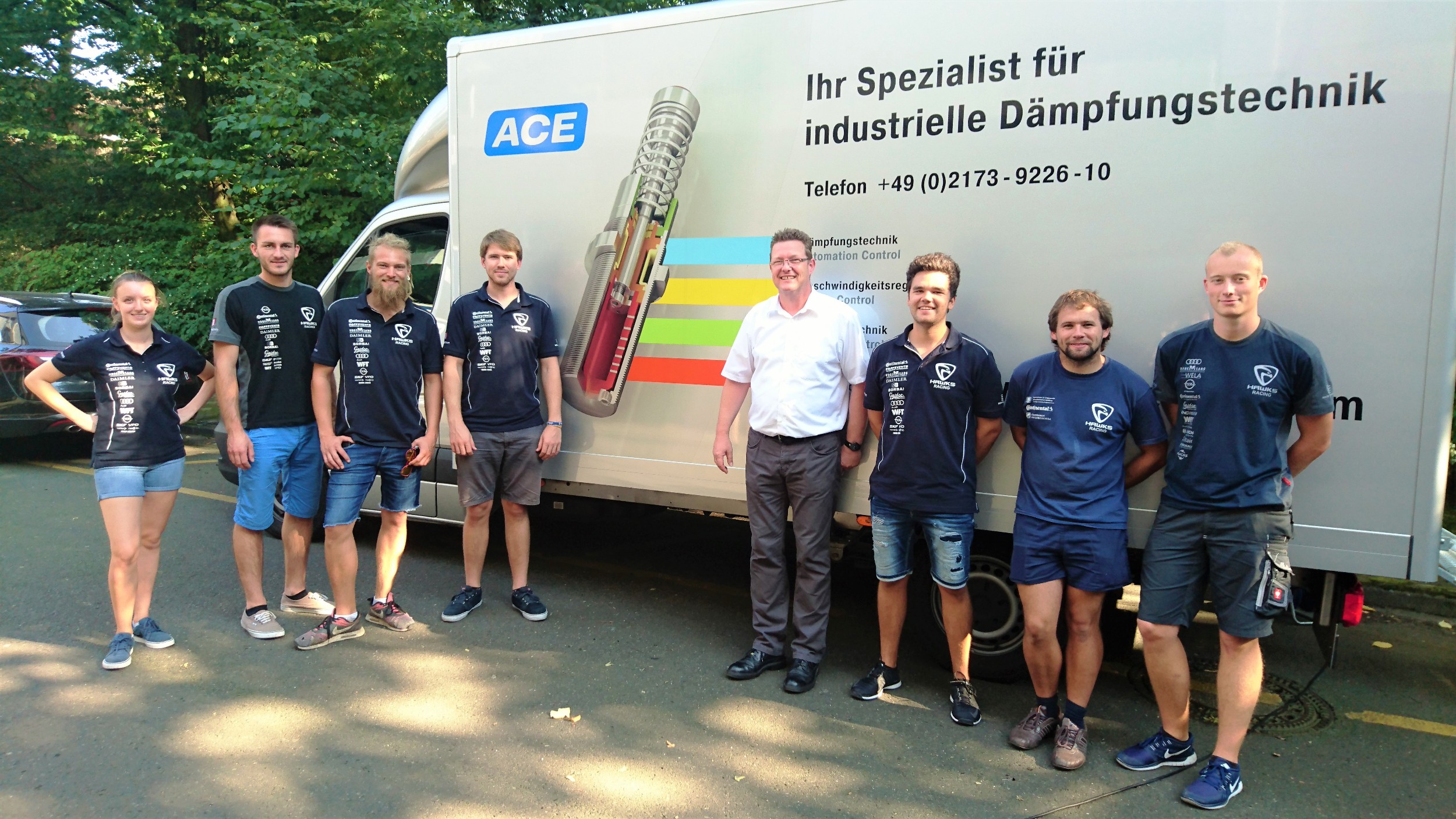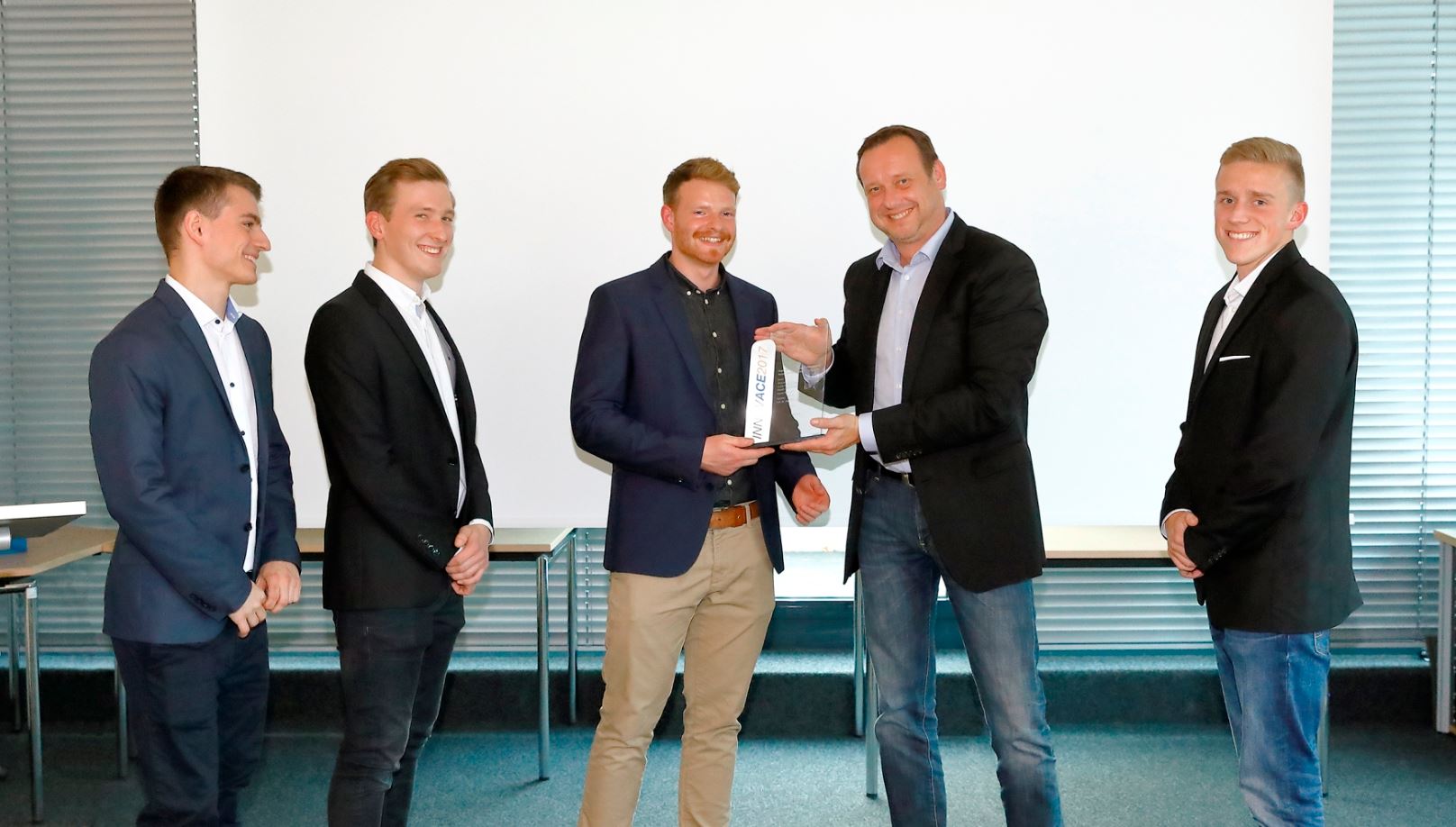 Siegerehrung Innovace 2021 (v. l. vorne): Jürgen Roland, Stabilus, Ibrahim Karadeniz, Ali Demir, Dr. Michael Büchsner, Stabilus, Loukmane Zemani, Ismail Joudar, Abdelhamid El Khetrani, Prof. Dr. Christian Jochum, alle Hochschule RheinMain Wiesbaden / Bild: ACE Stoßdämpfer GmbH