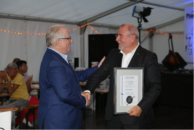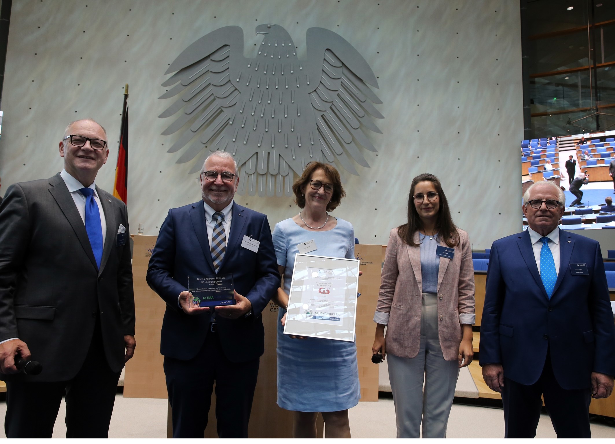 Senat der Wirtschaft, 18.09.2020 Bundestag Bonn, v.l.n.r. Dr. Christoph Brüssel, Vorstandsvorsitzender Stiftung Senat der Wirtschaft, Peter M. Wöllner, Geschäftsführer CiS electronic GmbH, Doris Wöllner, CSR-Beauftragte der CiS-Gruppe, Lara Dilger, wissenschaftliche Projektleitung Senat der Wirtschaft, Dieter Härte, Vorstandsvorsitzender Senat der Wirtschaft