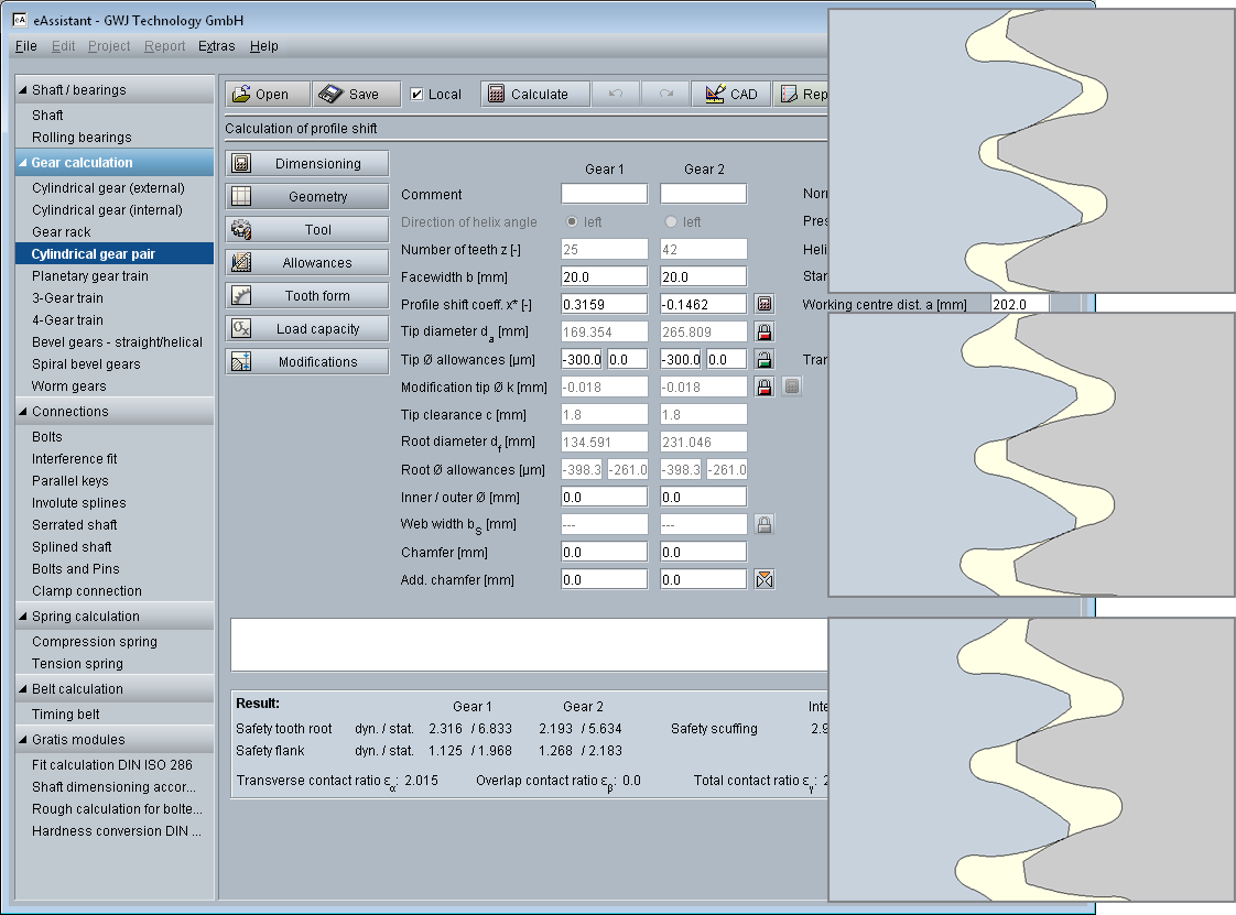 eAssistant cylindrical gear pair: Tooth form for different profile shifts
