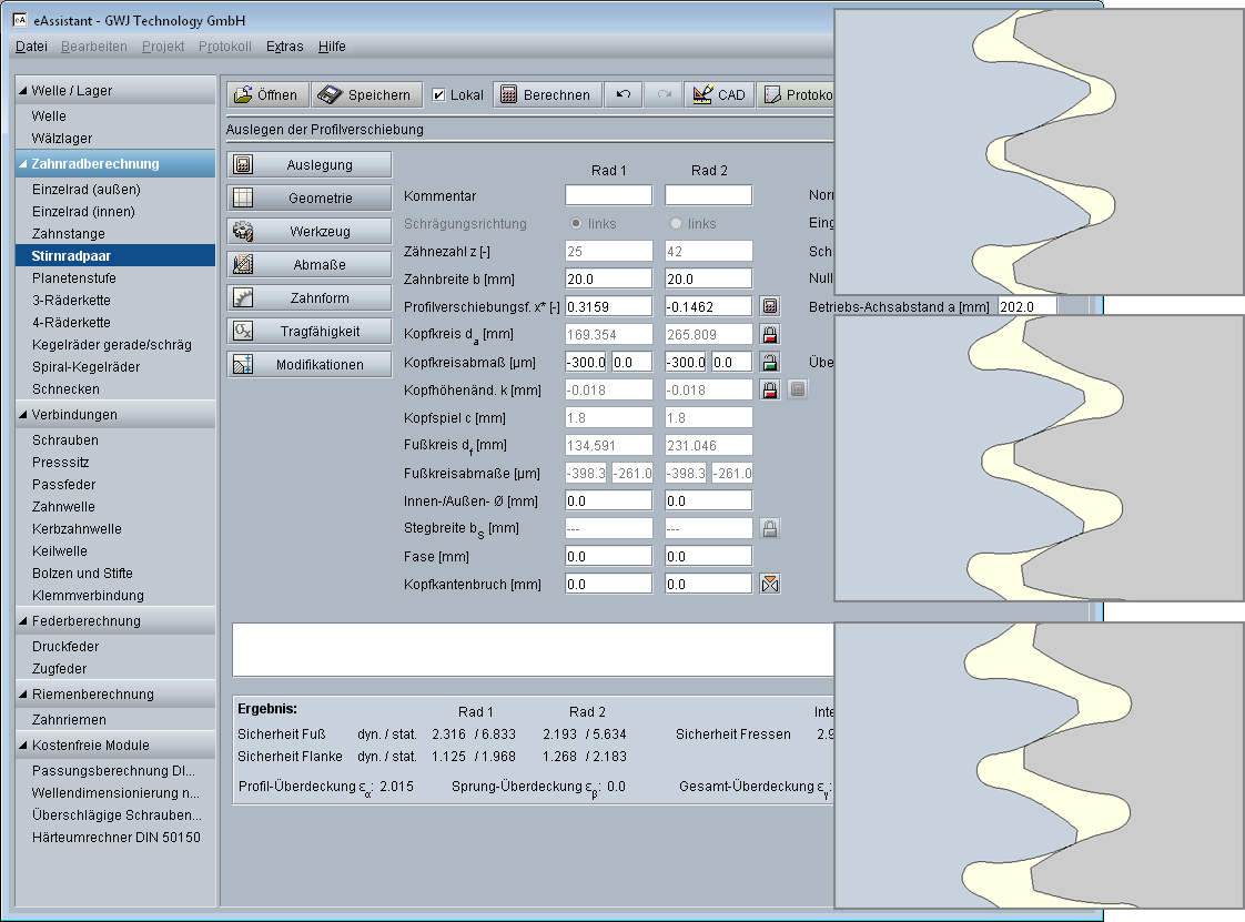 eAssistant-Stirnradpaar: Zahnform für verschiedene Profilverschiebungen
