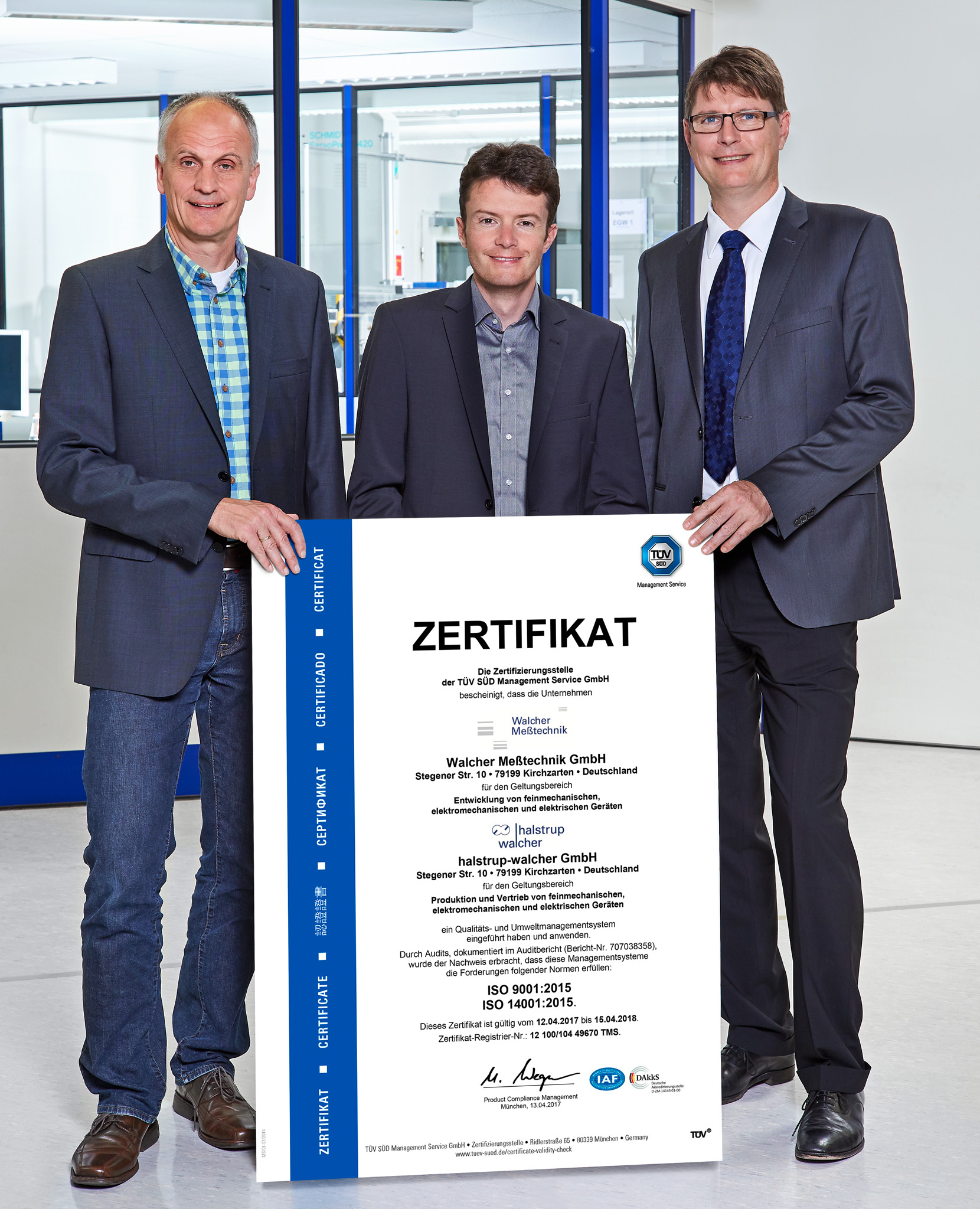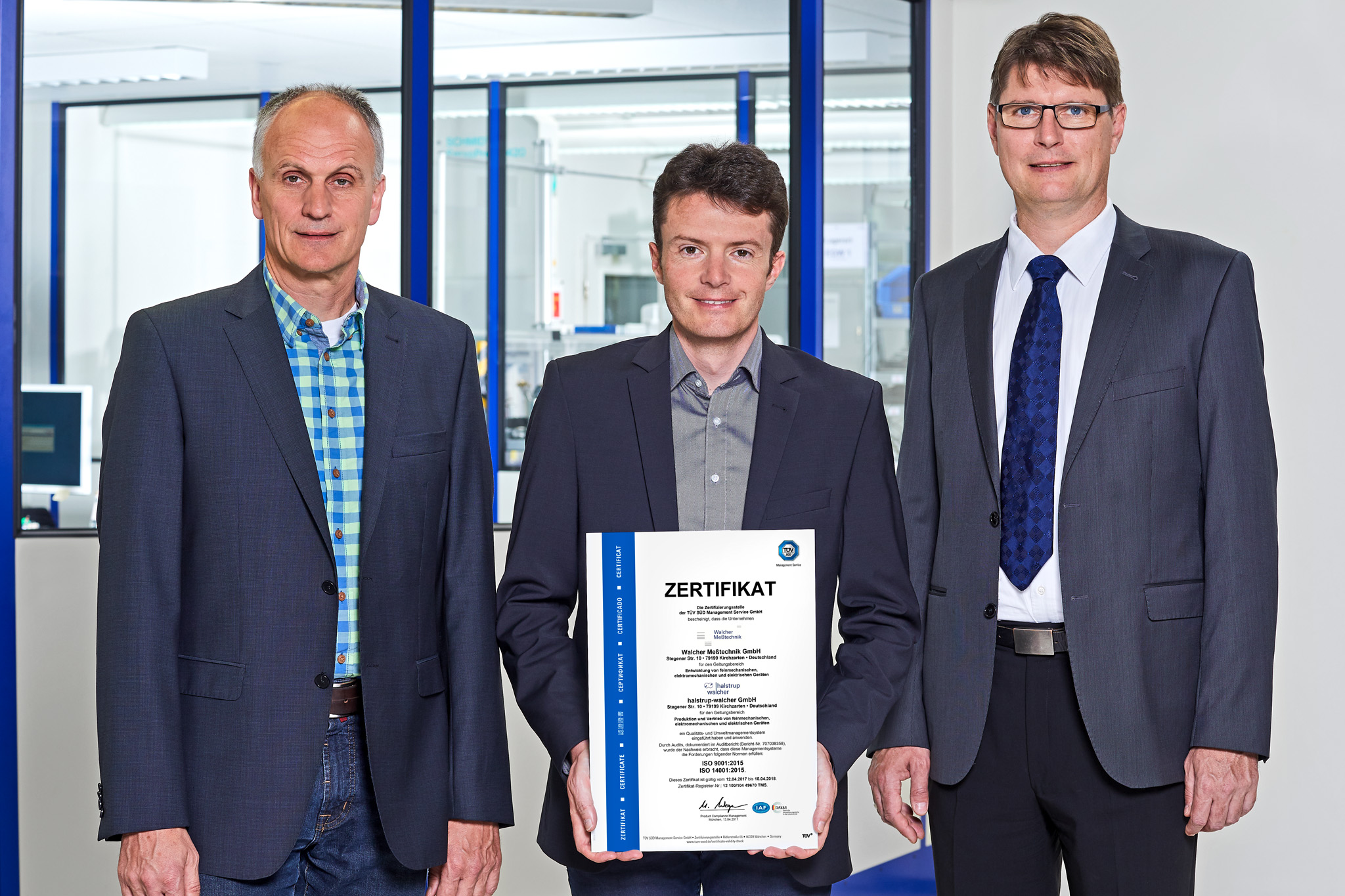 Glücklich über das Zertifikat nach DIN EN ISO 9001 und 14001: Fritz Blas, Leiter Materialwirtschaft und Umweltmanagementbeauftragter und Thomas Hoch, Leiter Qualitätsmanagement gemeinsam mit Hauptgeschäftsführer Jürgen Walcher