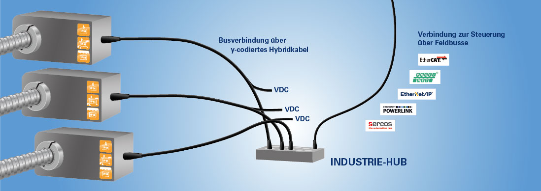 Indirekte Verkabelung der Positioniersysteme über einen Hub erlaubt den Anschluss über ein einzelnes Kabel
