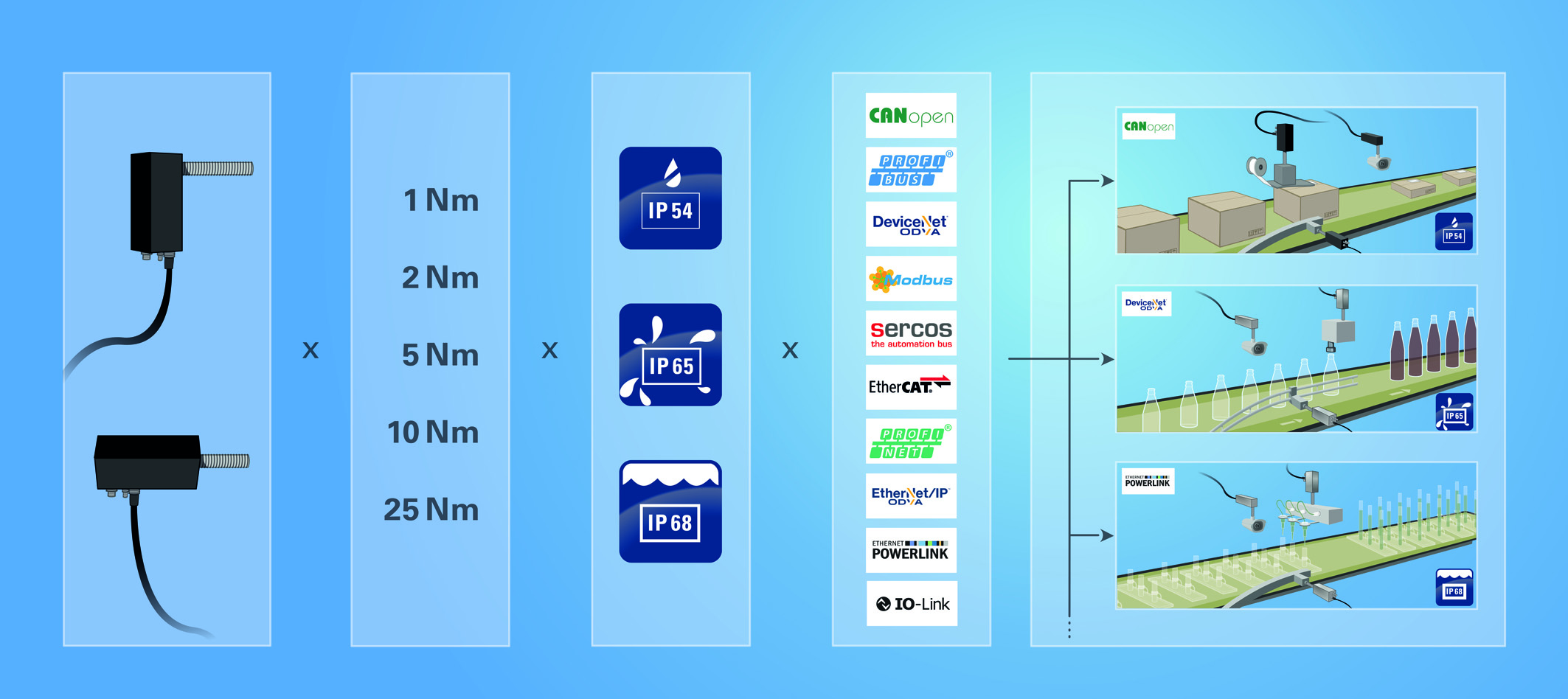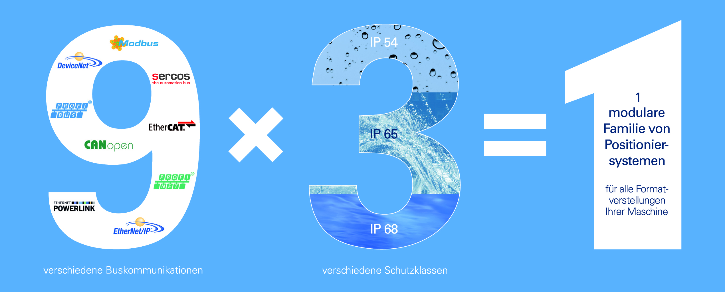 Das Baukastenkonzept für automatische Formatverstellung – mit Positioniersystemen, die sowohl in der Schutzklasse, als auch bei Thema Buskommunikation flexibel sind und zudem durch verschiedene Drehmomente auch breit eingesetzt werden können