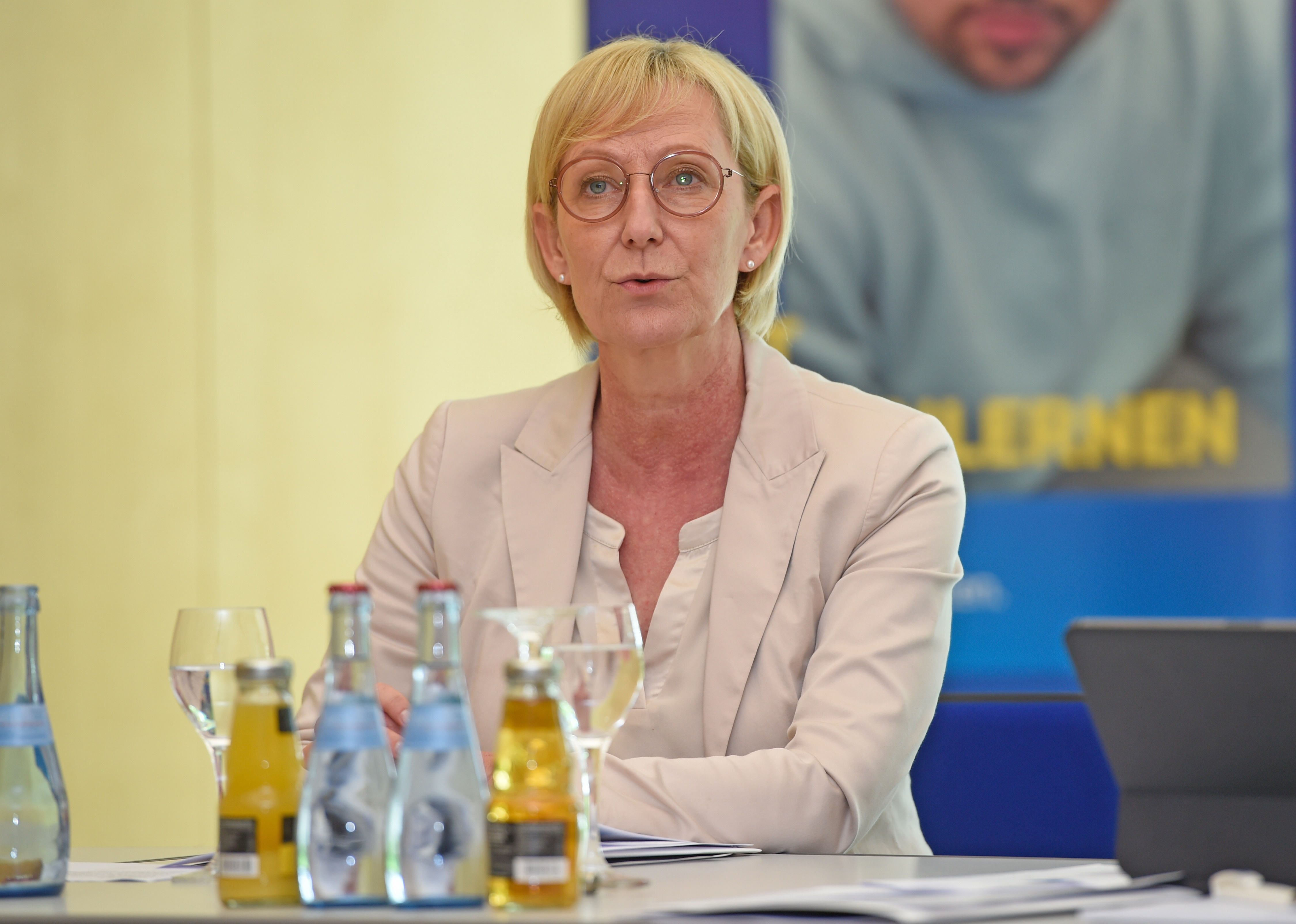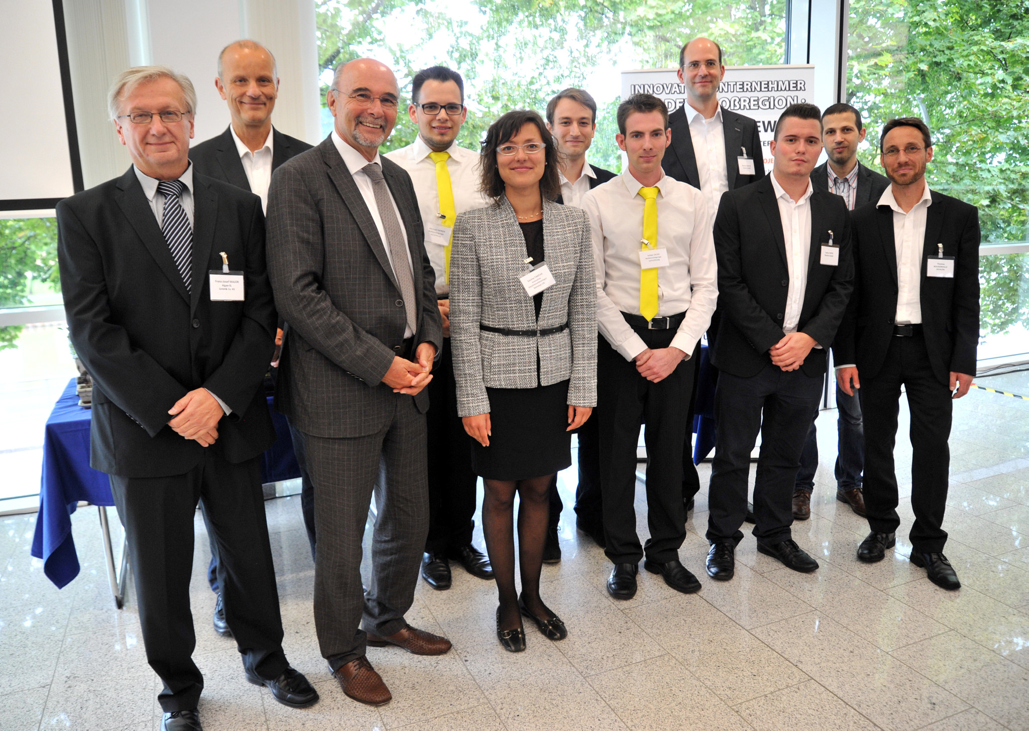 Von links: Dr. Frank Thomé (IHK, Hauptgeschäftsführer), Julia Luckenbill (BANS Coach), Marlene Rase (Honigmanufaktur Bliesgau), Christian Spieldenner (Honigmanufaktur Bliesgau), Doris Woll (Vorstandsvorsitzende SIKB/SWG), Anne Kaufmann (BANS Vorstand/BANS Coach), Elena Yorgova-Ramanauskas (Staatssekretärin MWIDE), Dr. Volker Brandenburg (BANS Coach), vorne kniend von links:Anas Alakkad (Pontem Pro), Majd Al Hamoud (Pontem Pro), hinten von links: Tim Berger (Blickfelduntersuchungen), Thomas Seiz (Blickfelduntersuchungen)