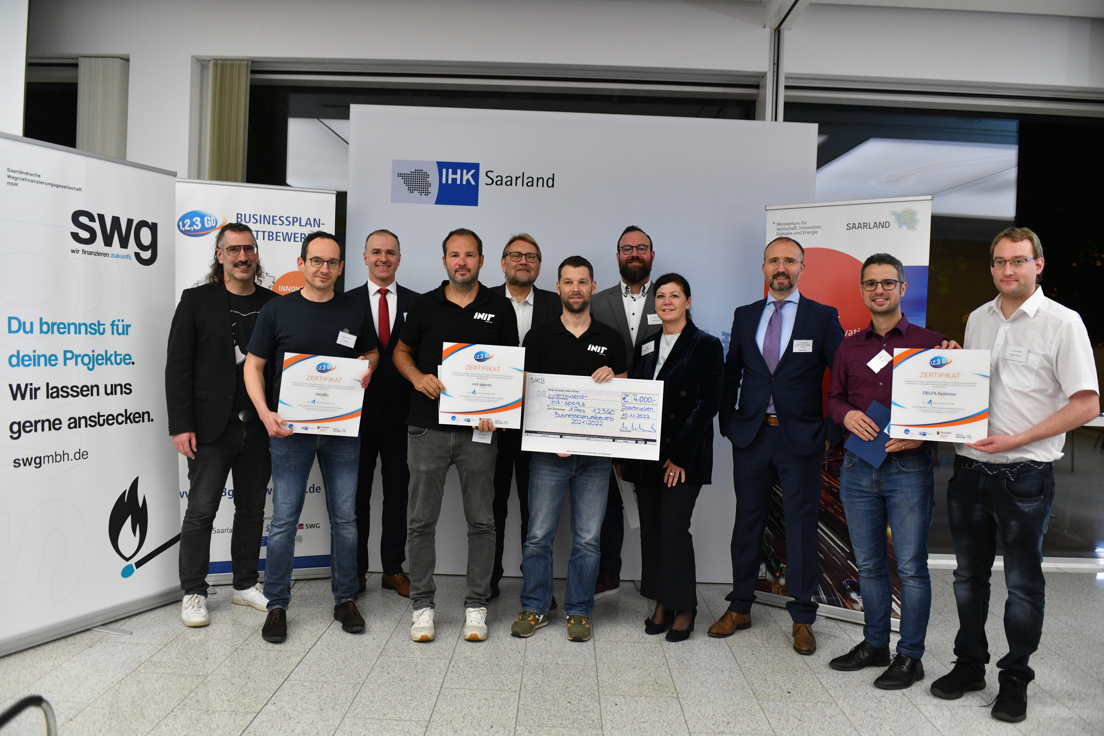 v.l.: Dr. Michael Bauer (Vorstand Business Angels Netzwerk Saarland), Alexander Hahn (KemBo), Dr. Frank Thomé (Hauptgeschäftsführer IHK Saarland), Marc Breuer (init-sports), Holger Maaß (Vorstand Business Angels Netzwerk Saarland), Daniel Grauvogel (init-sports), Dr. Philipp Linnebach (DELFA Systems), Doris Woll (Vorstandsvorsitzende SIKB), Dr. Holger Gillet (Abteilungsleiter Wirtschaftsförderung und Mittelstandspolitik, Ministerium für Wirtschaft, Innovation, Digitales und Energie), Dr. Steffen Hau (DELFA Systems), Dr. Dennis Meier (DELFA Systems)