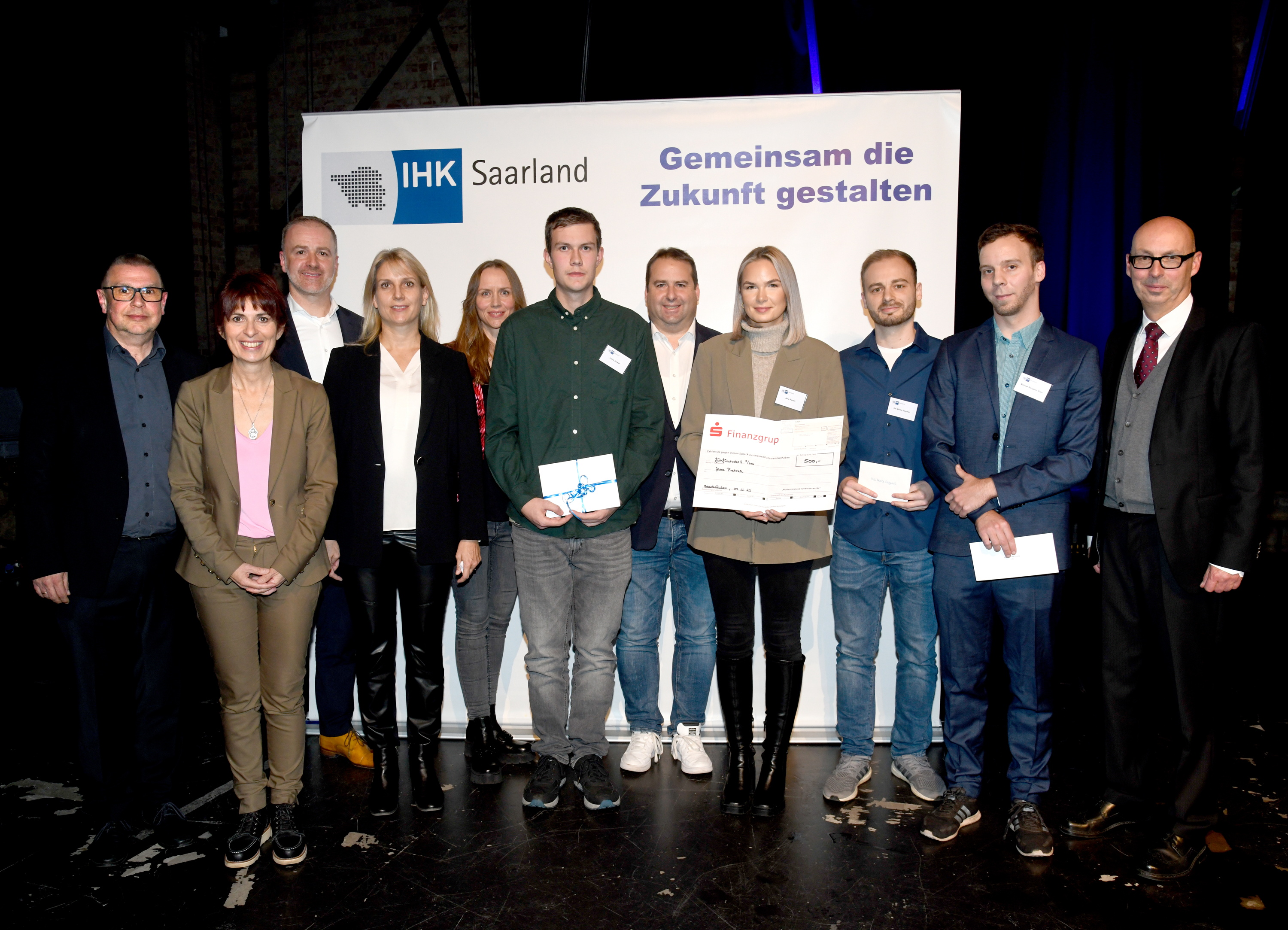 Das saarländische Siegerfoto beim Wettbewerb 1,2,3 GO (v.l.): Wirtschaftsstaatssekretärin Elena Yorgova-Ramanauskas, Max und Leon Bungert (TuneTales, 3. Platz), Holger Maaß (Business Angels Netzwerk Saarland, BANS), Sascha Schick (AnyHelpNow, 1. Platz), Annemie Kleemann (Resulo, 2. Platz), Erik Münz (BANS), Achim Köhler (SIKB), Tanimara Schwender (Ela Parem, Sonderpreis), IHK-Hauptgeschäftsführer Dr. Frank Thomé, Anne Kaufmann (BANS), Tim Falck (AnyHelpNow). / Foto: Reiner Voß
