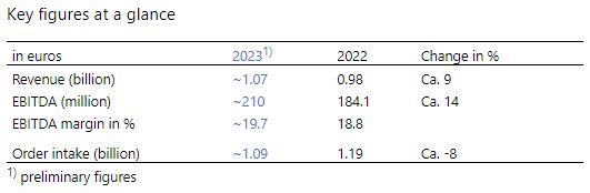 As expected, the Group’s order intake of approximately 1.09 billion euros in fiscal year 2023 was around 8 percent below the very high prior-year figure of 1.19 billion euros. The book-to-bill ratio was 1.02 (prior year: 1.21). Accordingly, the overall high order backlog increased slightly to around 745 million euros (31/12/2022: 733.7 million euros).