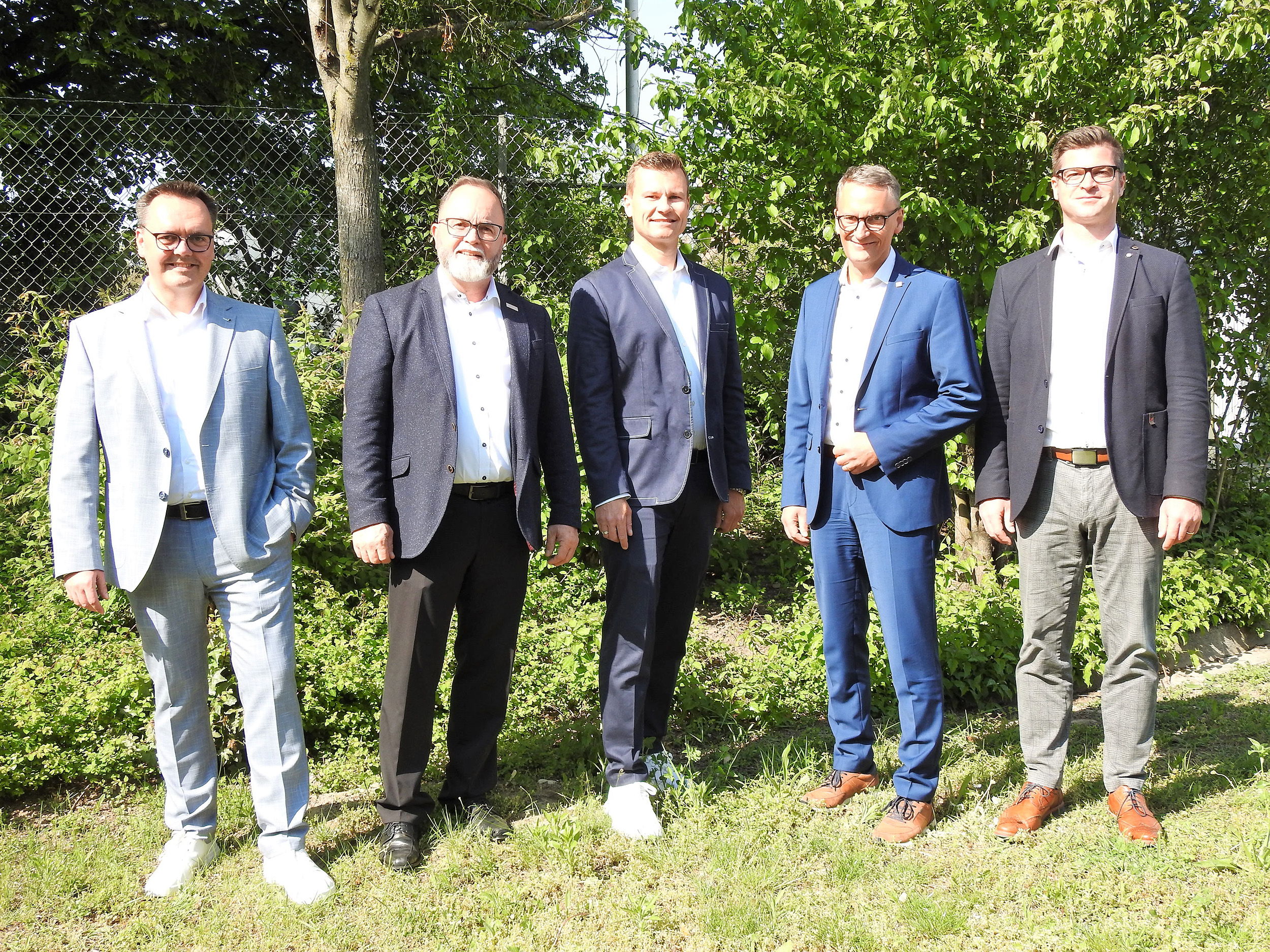 Stellen gemeinsam die Weichen für die erfolgreiche JULABO Standorterweiterung im startkLahr Airport & Business Park Raum Lahr: Ralf Wurth (kaufmännischer Geschäftsleiter JULABO), Thomas Schäfer (Bürgermeister Gemeinde Seelbach), Markus Juchheim (Geschäftsführer JULABO), Markus Ibert (Zweckverbandsvorsitzender Oberbürgermeister) und Daniel Halter (Verbandsdirektor) (v.l.n.r., ©Karlheinz Fischer/startkLahr)