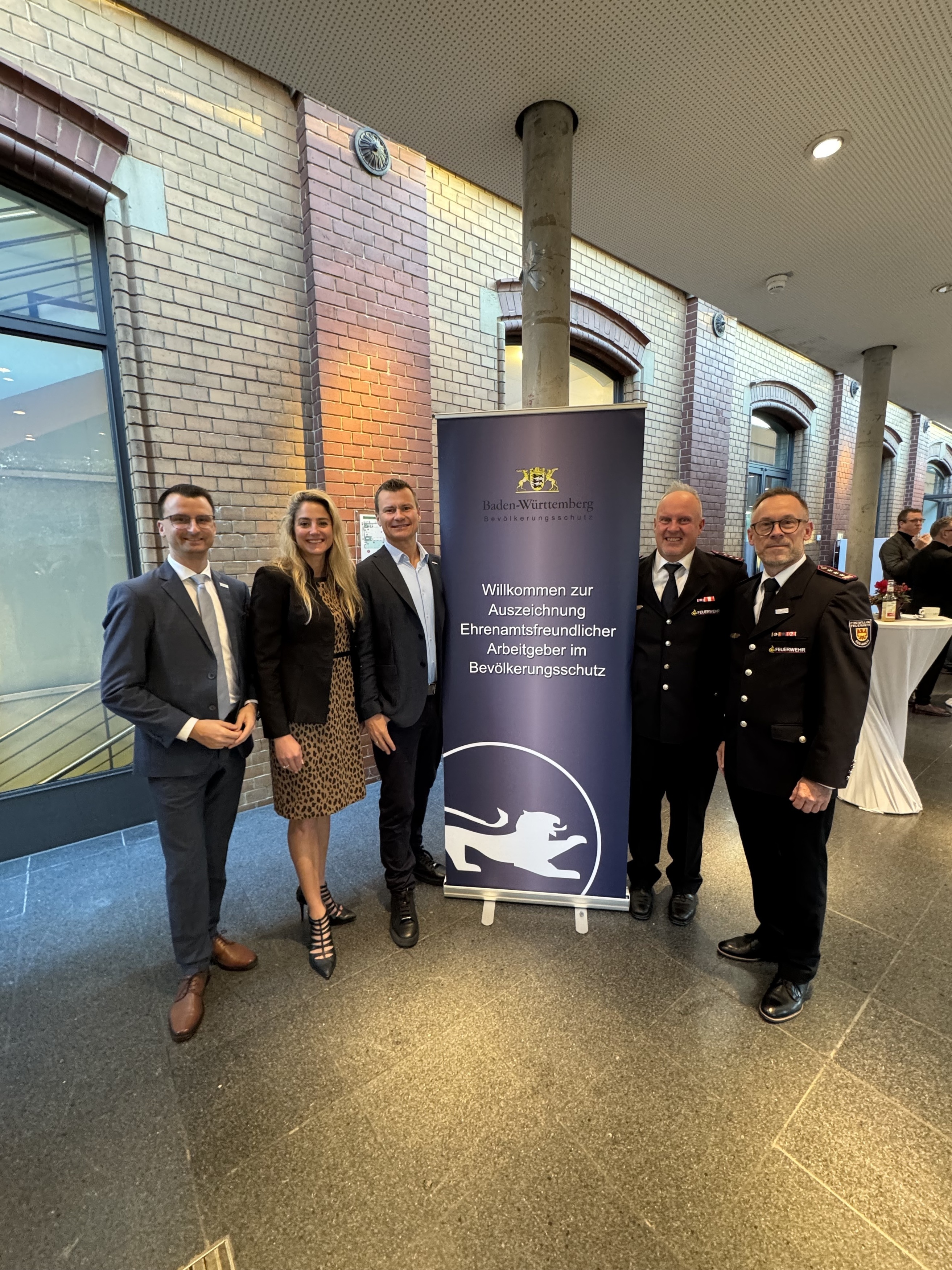 Das Land Baden-Württemberg würdigte die gelebte Partnerschaft zwischen Wirtschaft, Ehrenamt und Kommune in Seelbach. Von links: Bürgermeister Michael Moser, JULABO Firmenchef Markus Juchheim mit Ehefrau Jennifer Juchheim, ehem. Feuerwehrkommandant Bernd Wagner, Feuerwehrkommandant und Mitarbeiter Christian Vögele.