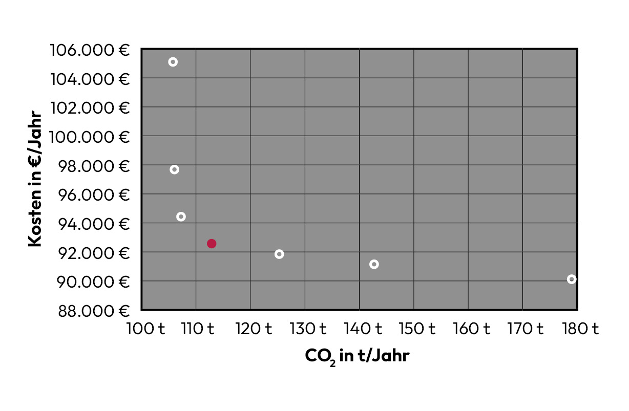 Bild: Exemplarischer Zusammenhang zwischen Kosten und CO2-Ausstoß in einem Energiesystem, dargestellt als Pareto-Front. Wichtigste Erkenntnis (in rot): Mit relativ geringen Investitionen können bereits sehr niedrige CO2-Emissionen erreicht werden.