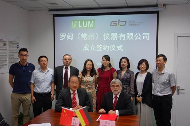 Dr. X. Zhou, Geschäftsführer German Innovation Center (vorn links), Prof. Dr. D. Lerche, Geschäftsführer LUM GmbH (vorn rechts) und weitere Teilnehmer der Gründungszeremonie