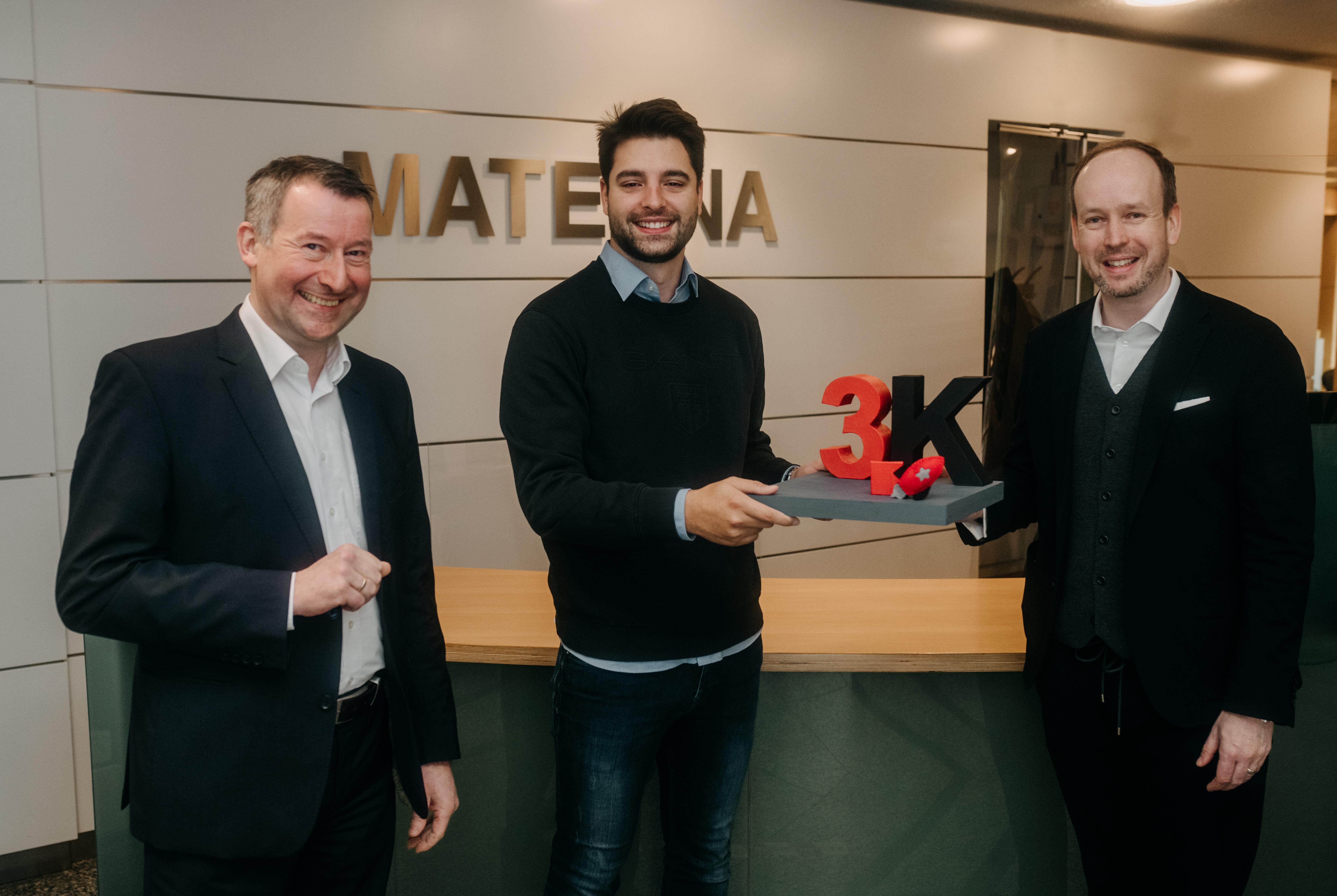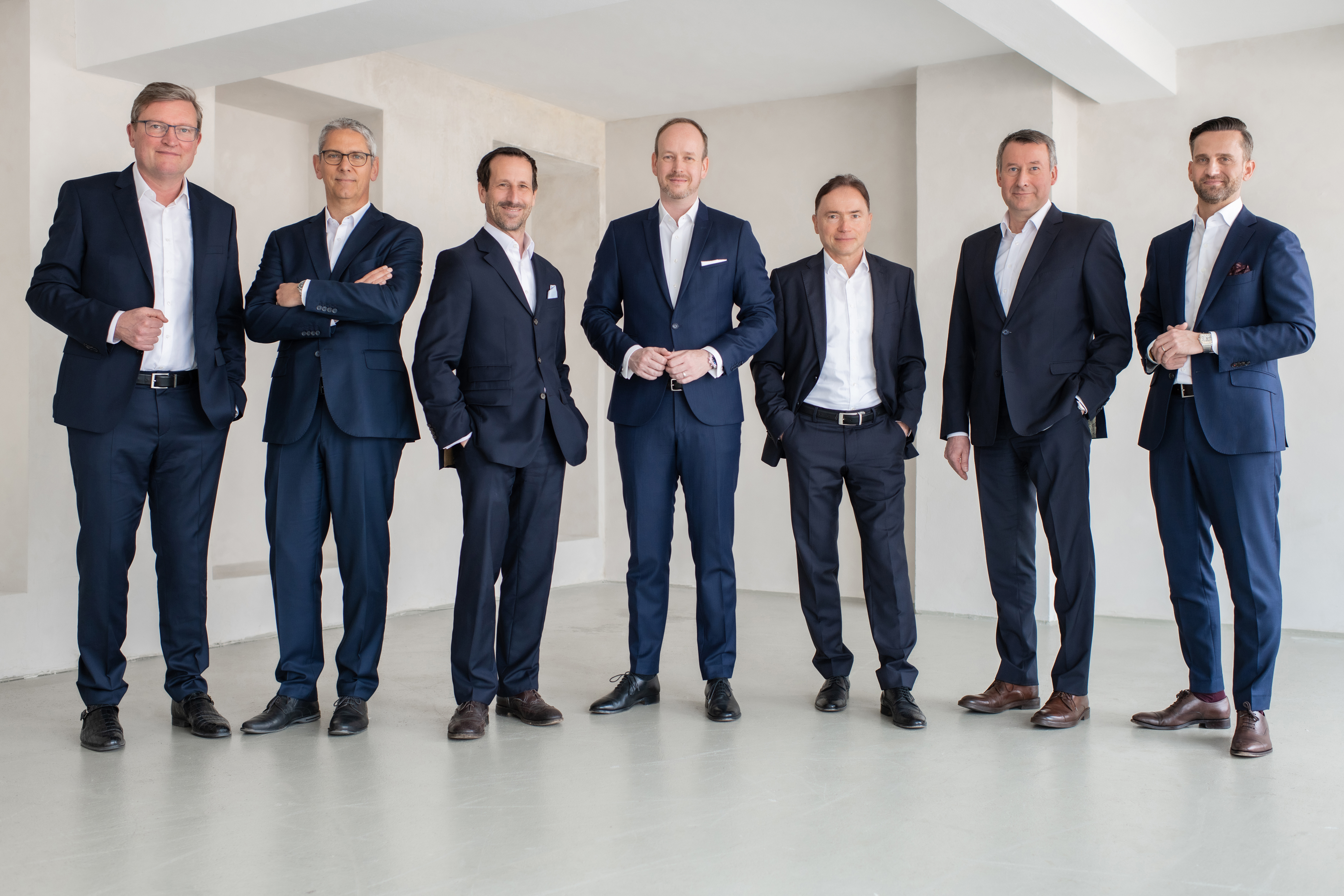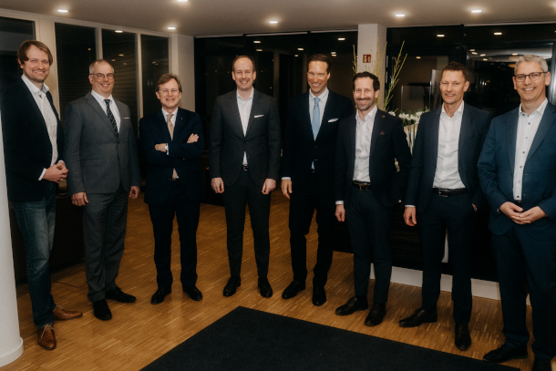 Vertragsunterschrift beim Notar v.l.n.r.: Paul Lange, Beteiligungsmanager der Materna-Gruppe, Manuel Vogel, VR-Präsident, Partner A&O Kreston AG, Dr. Boris Mariacher, ehemaliger Aufsichtsratsvorsitzender der Virtual Solution AG, Martin Wibbe, CEO der Materna-Gruppe, Nicolaus von Rintelen, ehemaliger Haupteigentümer der Virtual Solution AG, Dr. René Rüdinger, CFO der Materna-Gruppe, Sascha Wellershoff, CEO der Virtual Solution AG, Michael Hagedorn, EVP Public Sector der Materna-Gruppe, (Corona-ko