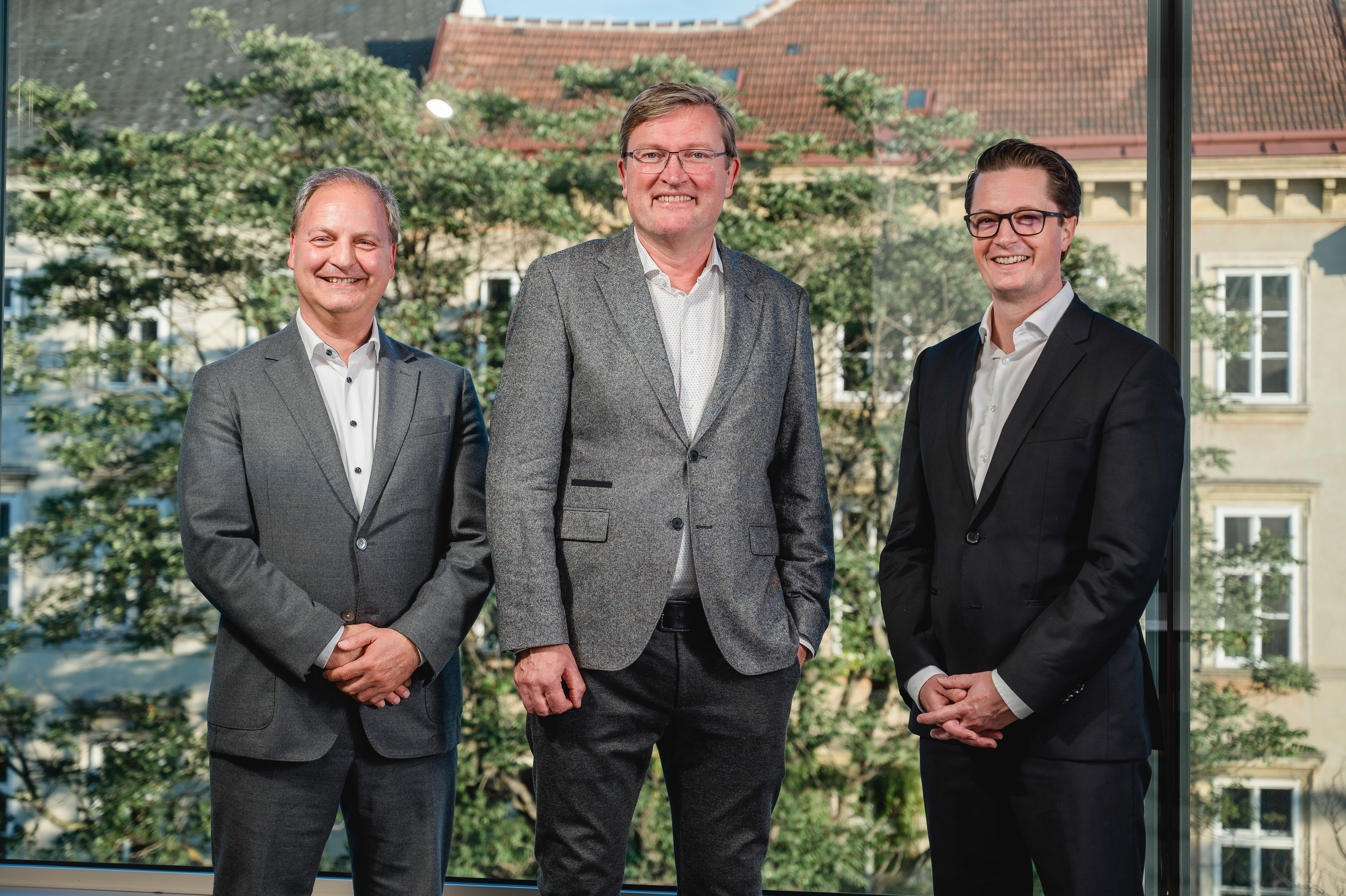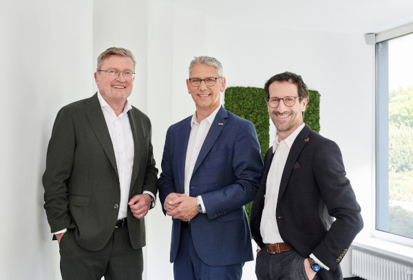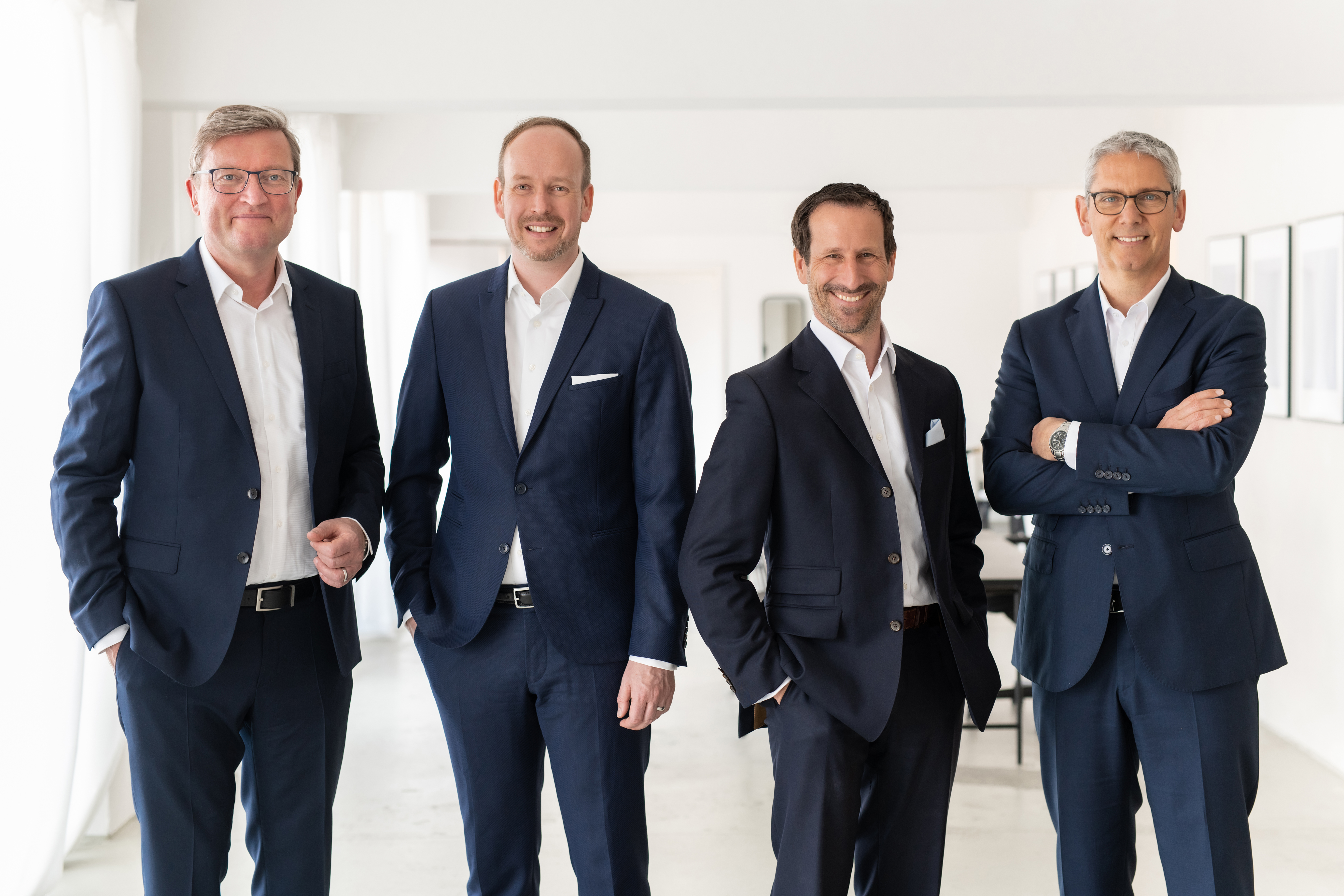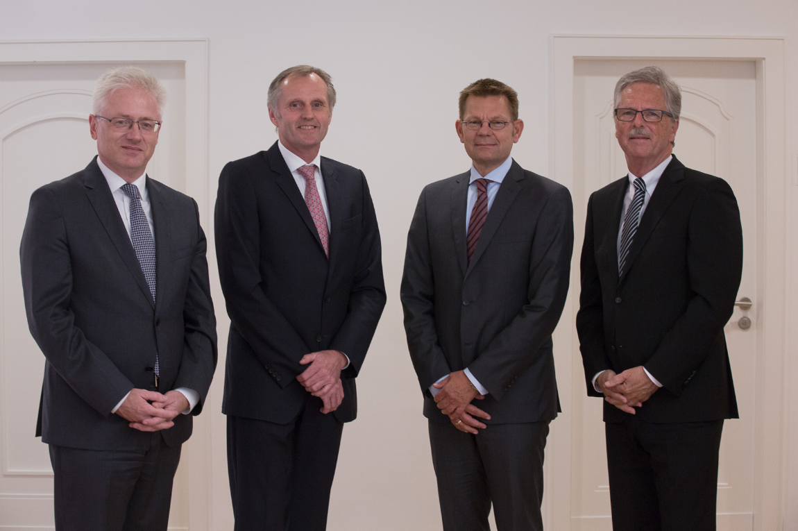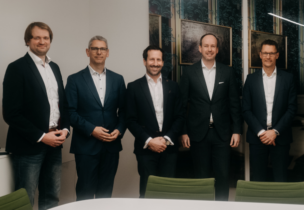 Vertragsunterschrift beim Notar v.l.n.r.: Paul Lange, Beteiligungsmanager der Materna-Gruppe, Michael Hagedorn, EVP Public Sector der Materna-Gruppe, Dr. René Rüdinger, CFO der Materna-Gruppe, Martin Wibbe, CEO der Materna-Gruppe, Sascha Wellershoff, CEO der Virtual Solution AG, (Corona-konformes Treffen)