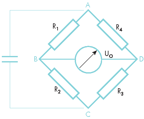 With a completely unloaded membrane, an output signal of 0mV is aimed for in most cases, i.e. R1=R2=R3=R4=R. As an example, this value R is set at 3500 ohms, while the supply voltage is 5V. This means that the voltages of B and D are both at 2.5V. Under maximum load, the resistance difference is 30 ohms, i.e. R1=R3=3530, R2=R4= 3470. The level at B thus rises to 2.521 V, at D it falls to 2.479 V. This results in an output signal of 42.1mV between B and D at maximum pressurisation. This signal can then be amplified and further conditioned to achieve maximum accuracy.
