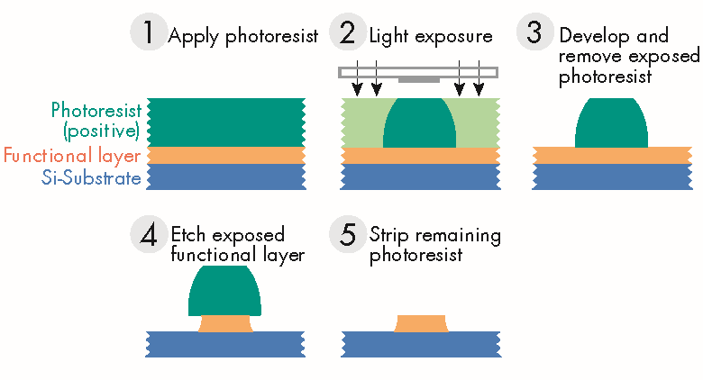 To gain functionality from these deposited layers, they must be structured. This is done through selective etching, which is in turn enabled by photolithography. To do this, a photoresist is first applied to the wafer, often by means of spin coating. This is then selectively exposed through an optical mask. This exposure changes the chemical properties of the resist in such a way that only the chemically altered regions of the resist can be removed in the next step, in the case of positive resist, or only the unaltered regions of the resist can be removed in the case of negative resist.