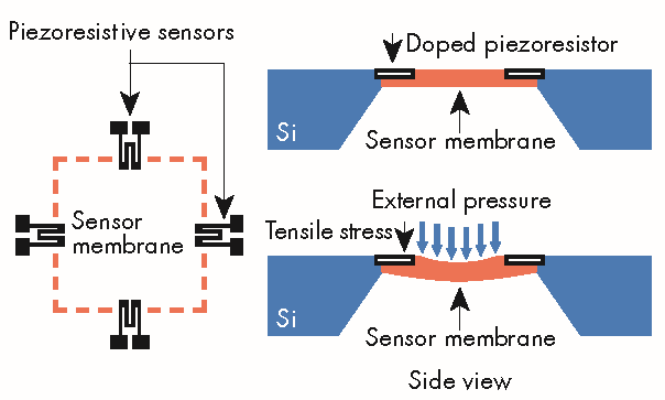 In piezoresistive MEMS pressure sensors, the diaphragm is made of silicon. The most important parameters of the diaphragm are its surface area and thickness. Larger and thinner diaphragms are generally required to measure smaller pressure differences.
