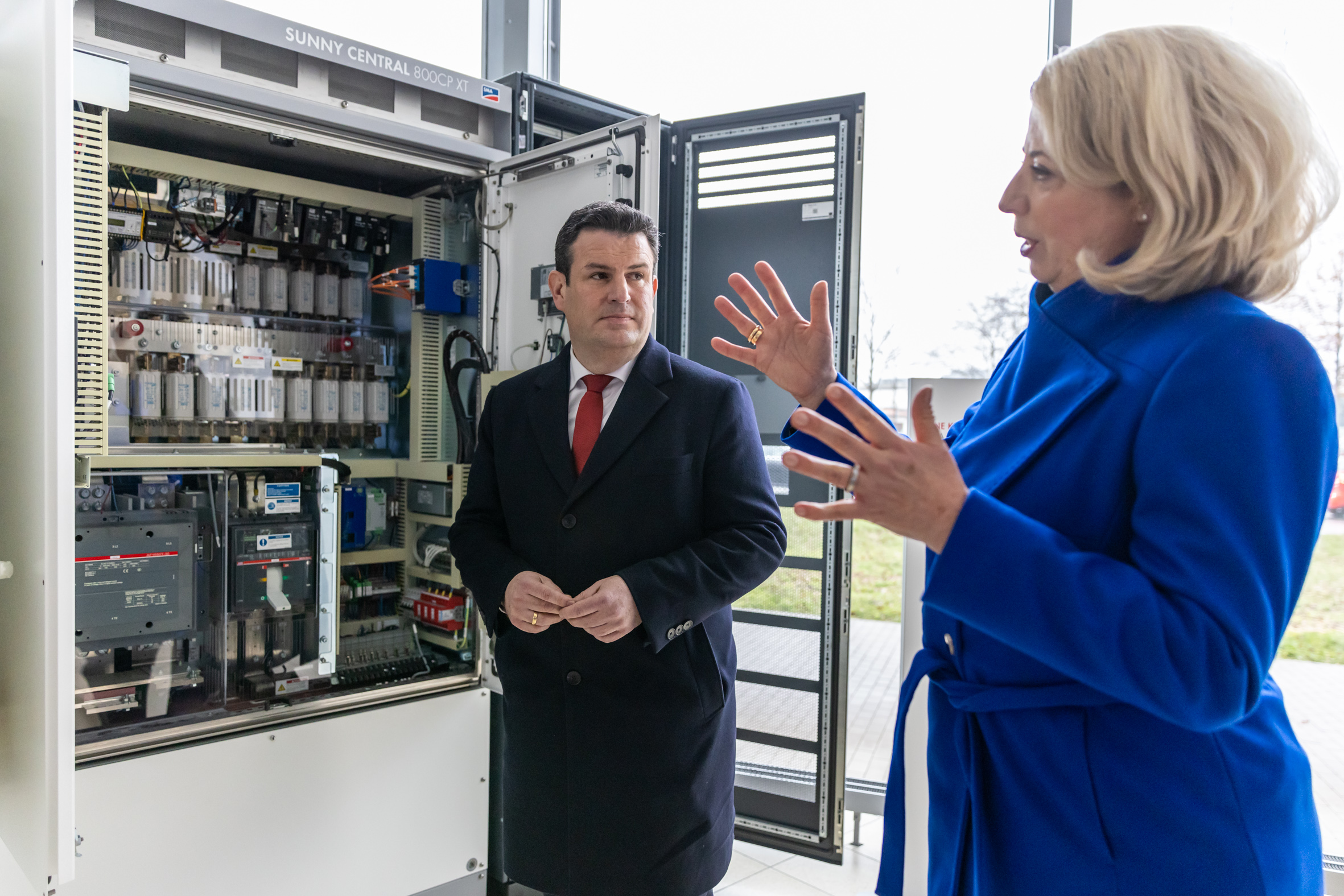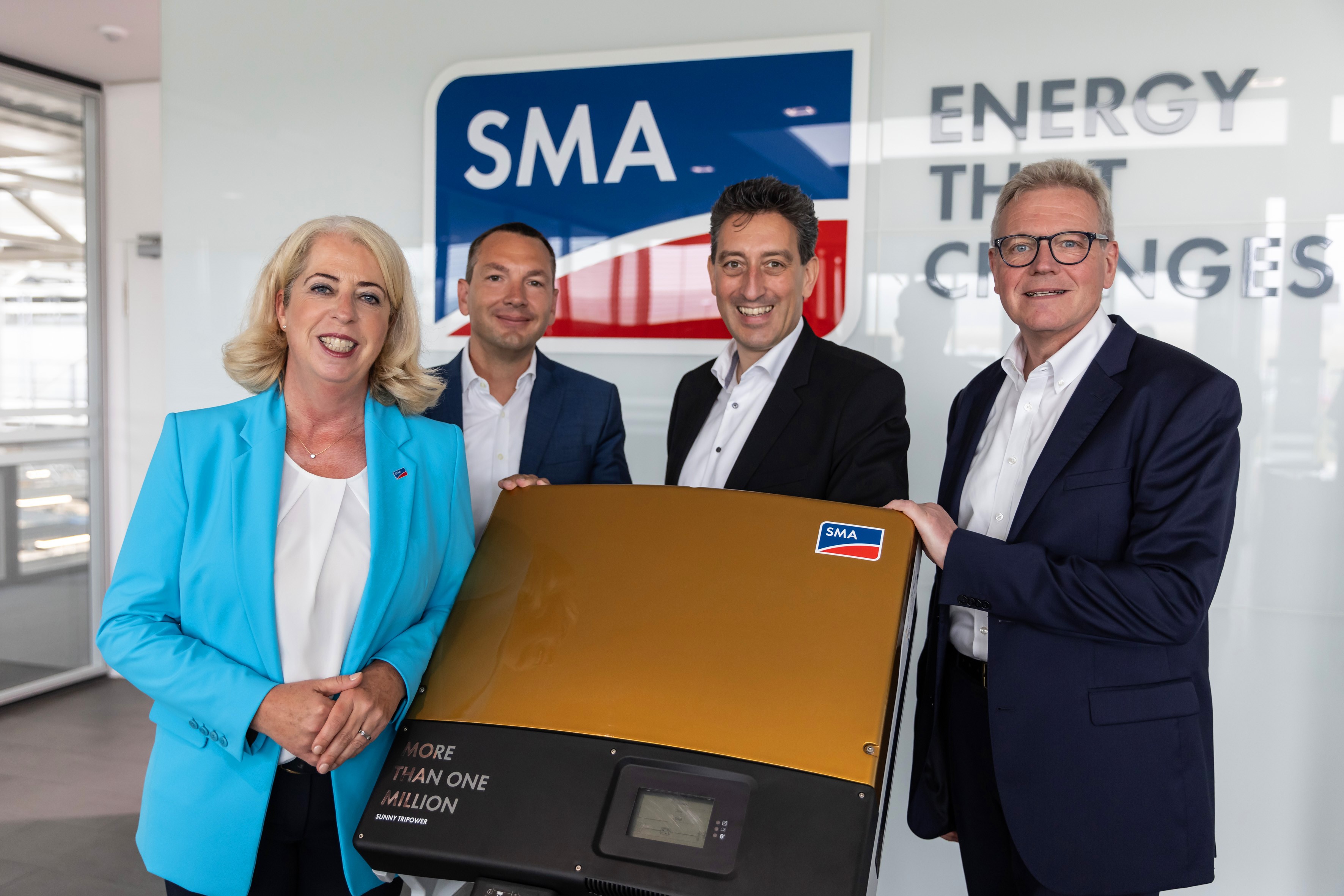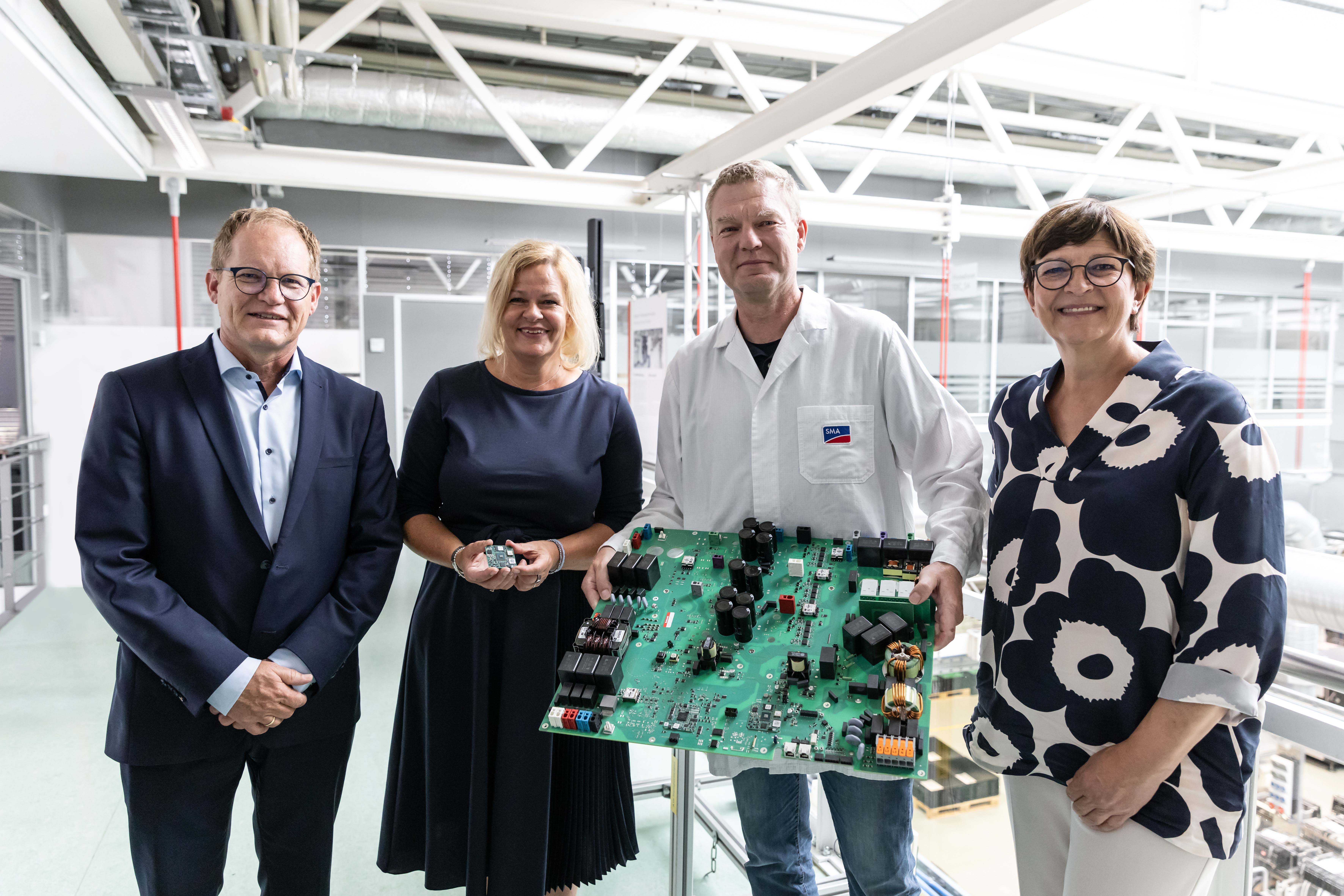 Spatenstich für die SMA GIGAWATT FACTORY: Andreas Siebert, Landrat des Landkreises Kassel (von links), Timon Gremmels, Mitglied des Bundestags, Mark Weinmeister, Regierungspräsident des Regierungsbezirks Kassel, Barbara Gregor, SMA Finanzvorständin, Jürgen Reinert, SMA Vorstandssprecher, Fred-Martin Dillenberger, Leiter Corporate Real Estate Management SMA, Marcel Brückmann, Bürgermeister Gemeinde Niestetal.