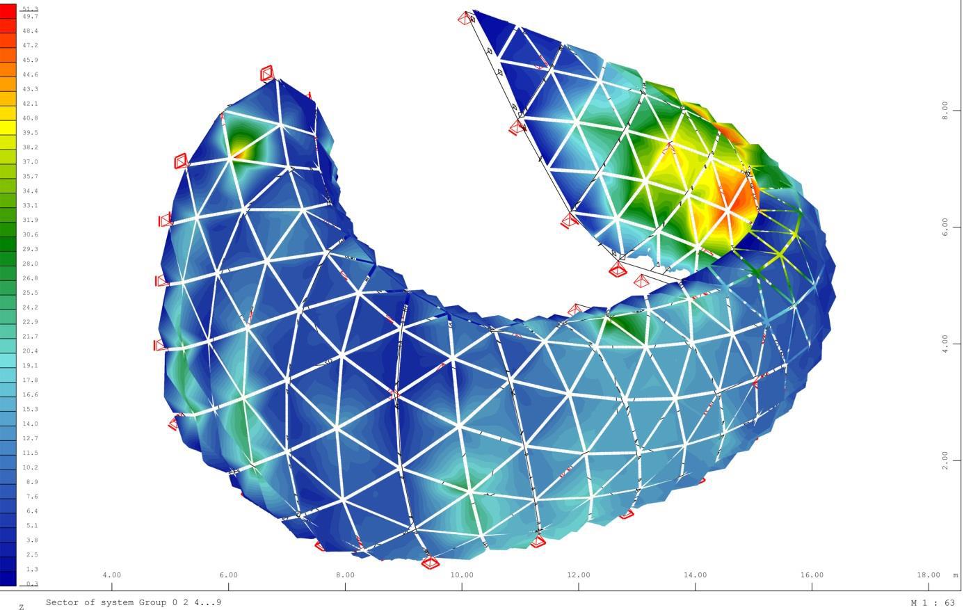 The freeform bioplastic facade works as a sheet material, shell-based structure with additional loadbearing and bracing ring carriers and joists. Contrary to common non-loadbearing facade constructions, this construction involves the loadbearing properties of the double curved skin (made of 3.5 mm thick bioplastic pyramids which are coupled together) as main bracing element for the entire system. On the one hand, this innovative measure shows the potential of modified bioplastics as a bracing material (up to E≈4000N/mm²) suitable for exterior applications as it adds only a minor load due to its reduced self-weight (13kN/m³); on the other hand, it allows for the construction of a facade that utilizes a minimised number of support points and/or mounting brackets on the structural system behind it.