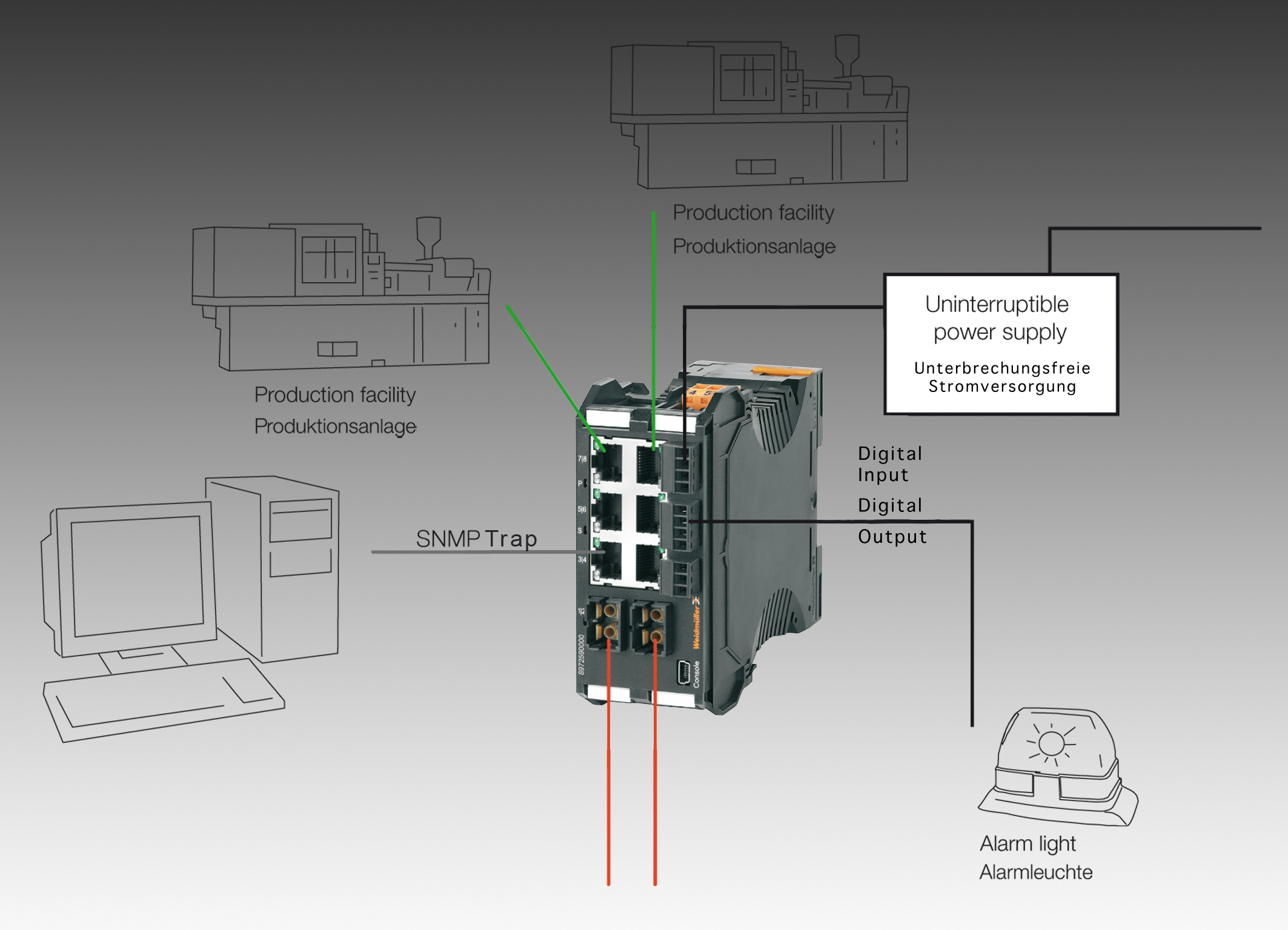 Weidmüller's new generation of managed switches in the WaveLine housing (degree of protection IP20) offers a full management switch solution. With their extremely compact design size and favourable port/price ratio the new WaveLine managed switches represent a cost-efficient solution for deployment in industrial networks. Optionally available with two digital signalling inputs and two digital signalling outputs WaveLine switches ensure high-levels of transparency in industrial networks. Once the I/Os have been configured network parameters can be monitored directly via the managed switch - without additional PLC intervention. If, for example, an Uninterruptible Power Supply (USP) is coupled to the I/Os the USP switches to battery backup should the supply voltage fail. The signalling output wired to the WaveLine managed switch issues an SNMP message (trap) - for instance to the higher-level SCADA system on the network server. At the same time it is possible to activate an alarm warning lamp outside the electrical cabinet via the outputs to provide an additional visual warning of the power failure.
