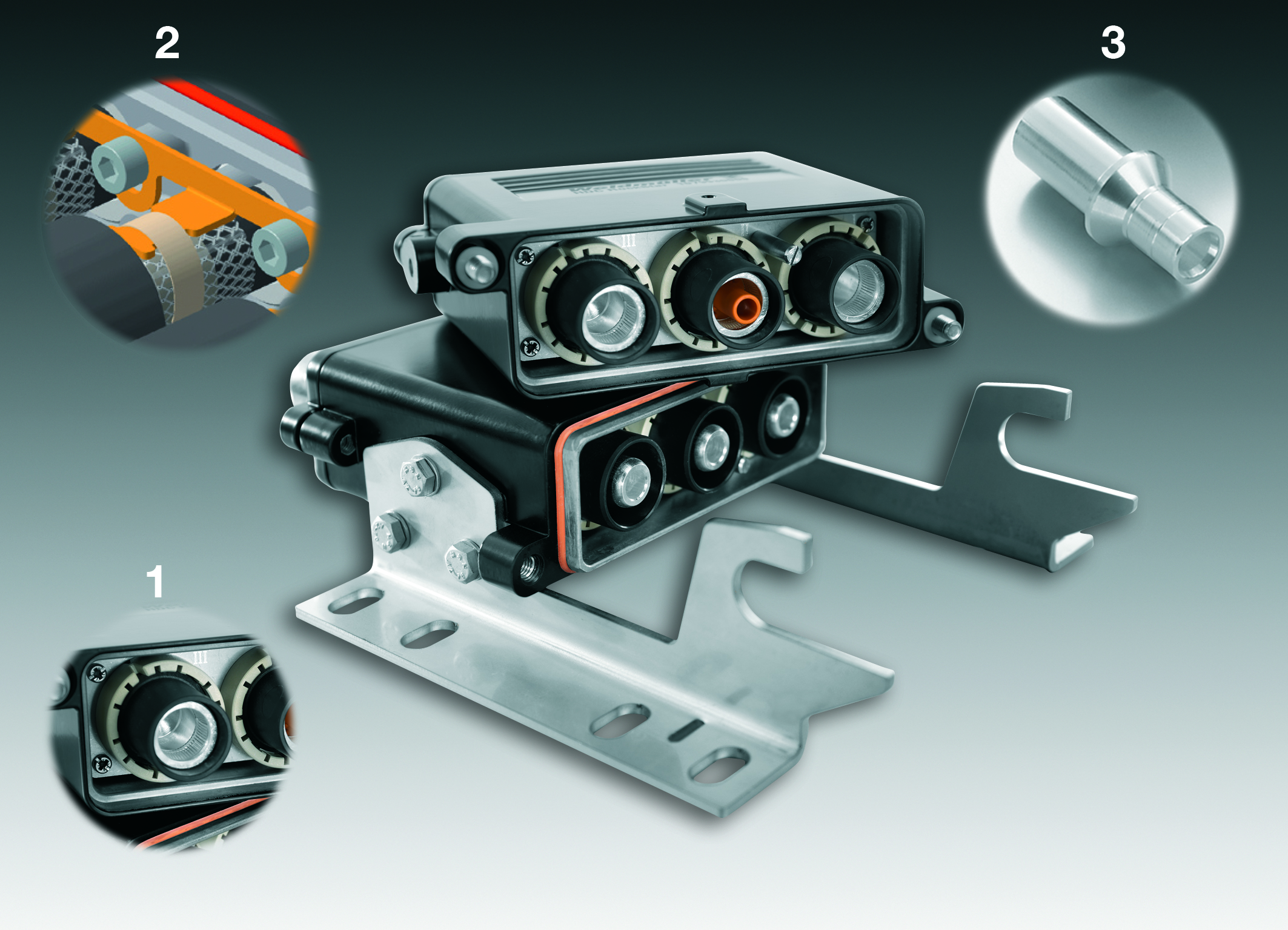 Fig. 2: Weidmüller's 'RockStar® HighPower' - The modular high current connector has been developed for applications in transport engineering and wind turbine generator systems. Detail 1: crimp contact system rated for max. 550 A and 4,000 V. Detail 2: shield connection integrated in the housing. Detail 3: fieldproven, maintenancefree crimp connection technology for copper conductors up to 240 mm2.