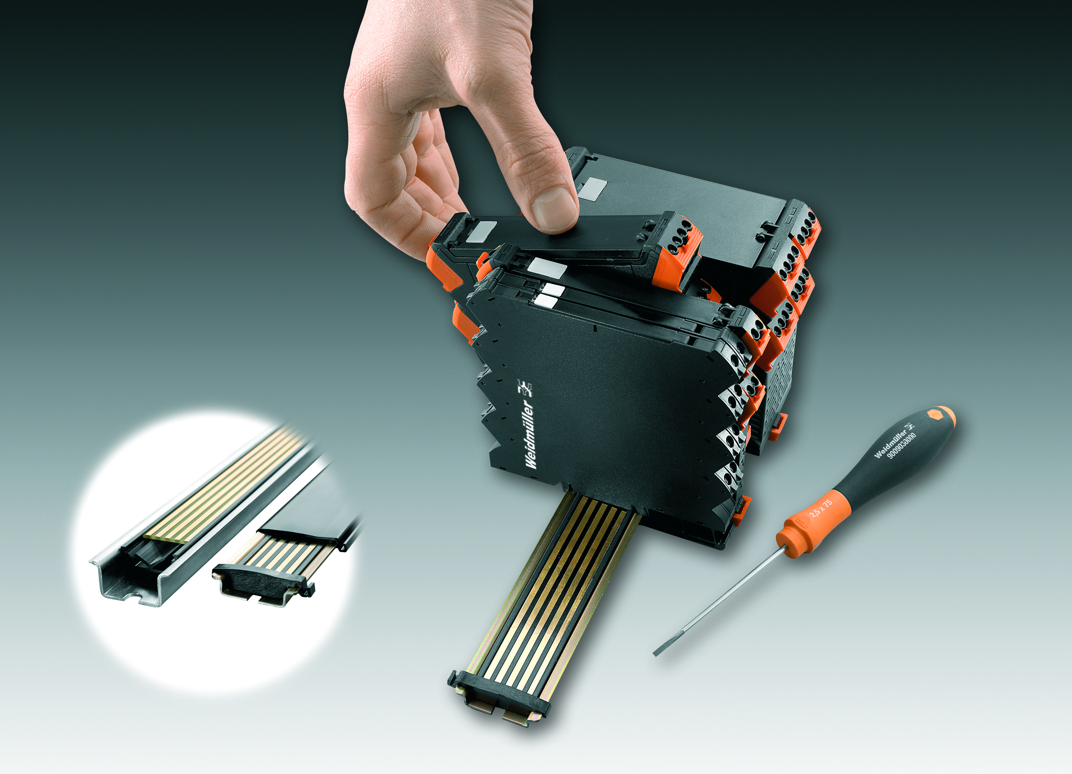 The system bus is designed to be securely integrated in standard 35 mm mounting rails. It supports freedom of configuration and individual module placement on TS 35 x7.5 or x15 mm tophat rails to DIN EN 60715. The new bus connection allows all modules of the "CH20M" family of housings to be crossconnected and networked; and it goes without saying that this compelling feature applies to all housing widths - from 6 mm to 12.5 mm through to 67 mm. This is a unique design feature. None of the other housing systems based on a mounting rail bus system available on the market today can compete. Weidmüller has designed its "CH20M-BUS" to be installation and service friendly, which means each module can be replaced quickly if the need arises. Straightforward replacement does not require that the entire group has to be taken apart. The individual modules are simply swivelled in and out of the module group.