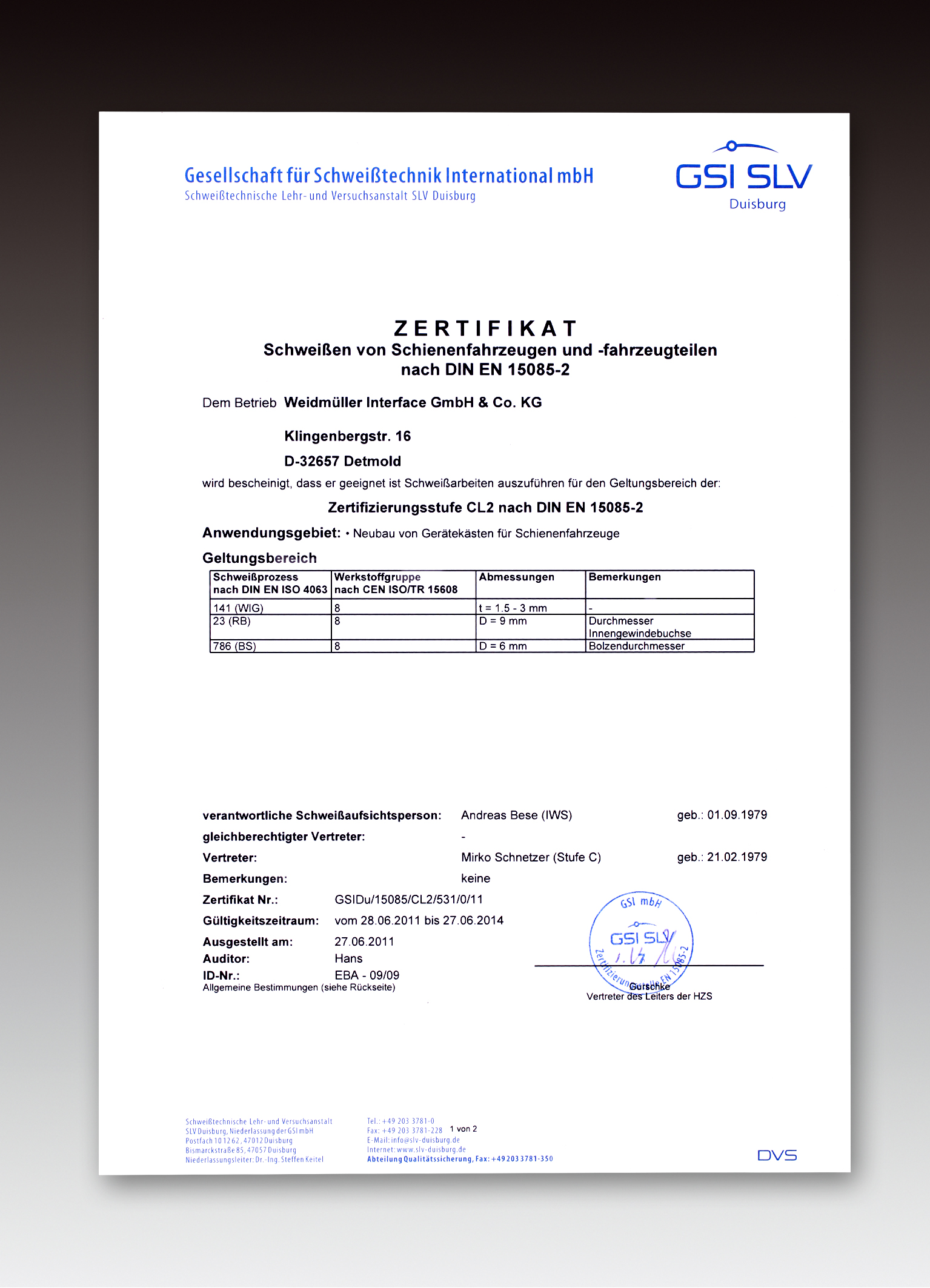 (pressebox) (Detmold, 2011-09-01) The German-based Gesellschaft für Schweißtechnik International mgh (GSI SLV) has certified Weidmüller's "Klippon®" stainless steel enclosures production operations in accordance with the international standard regulating quality requirements for fusion welding of metallic materials DIN EN ISO 3834-3 and to DIN EN 15085-2 regulating the welding of railway vehicles and components. In doing so it has verified Weidmüller's modern methods of production incorporating state-of-the-art engineering technology. The production process and weld seams guarantee the enclosures provide best-possible protection functionality. The certificate entitles Weidmüller's stainless-steel enclosure production to perform welding engineering work for the field of railway vehicles and components. Operating its own flexible production in Detmold enables Weidmüller to offer all-embracing, application-specific solutions.