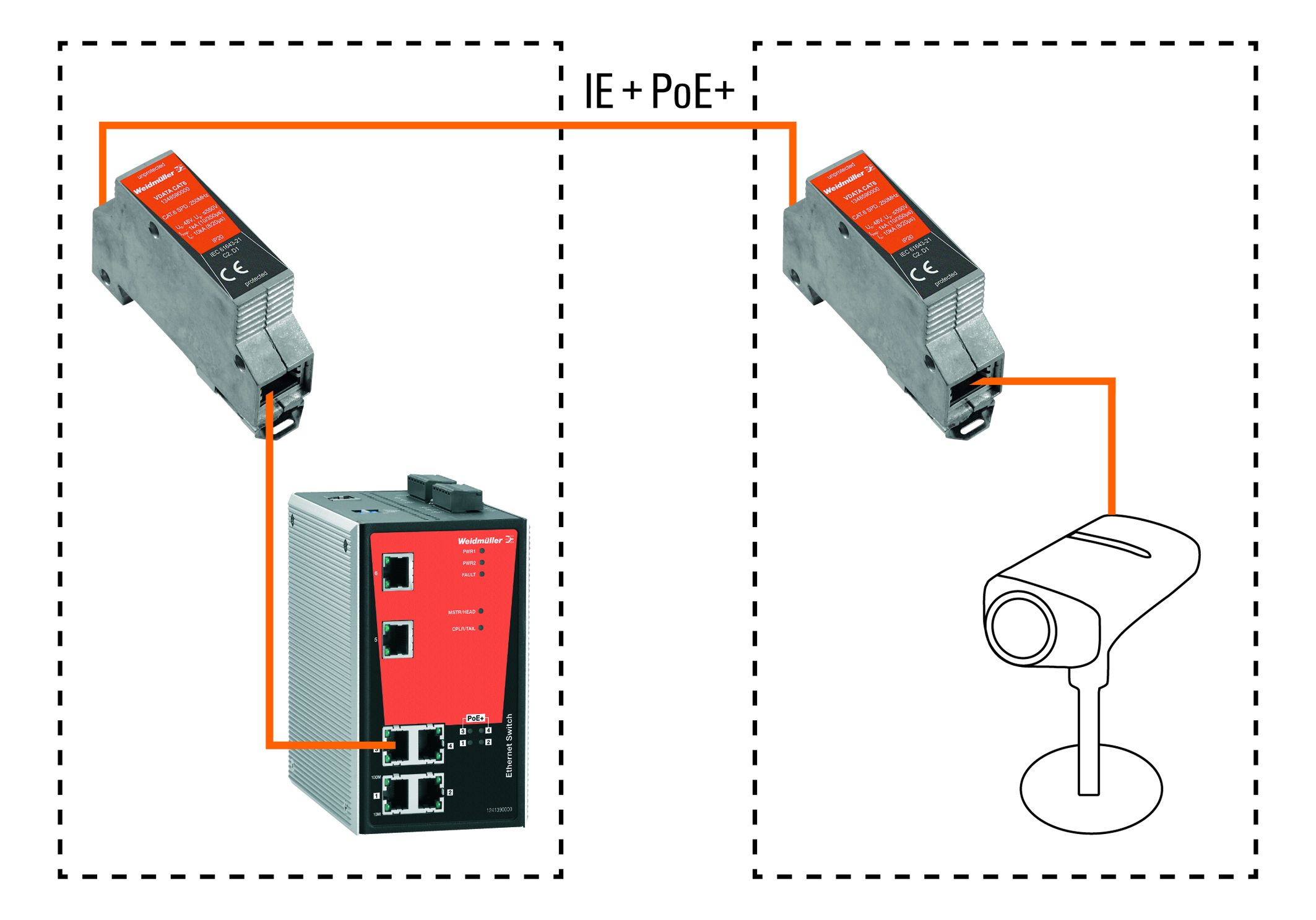VARITECTOR DATA CAT6 is designed for four pairs of wires with a RJ45 bush. The surge voltage protection device protects both Ethernet and Power-over-Ethernet networks – it is suited to PoE (according to IEEE 802.3af) and PoE+ (according to IEEE 802.3at). The cables available as options from Weidmüller are sized so well that power received by Power-over-Ethernet can also be transferred to other devices.