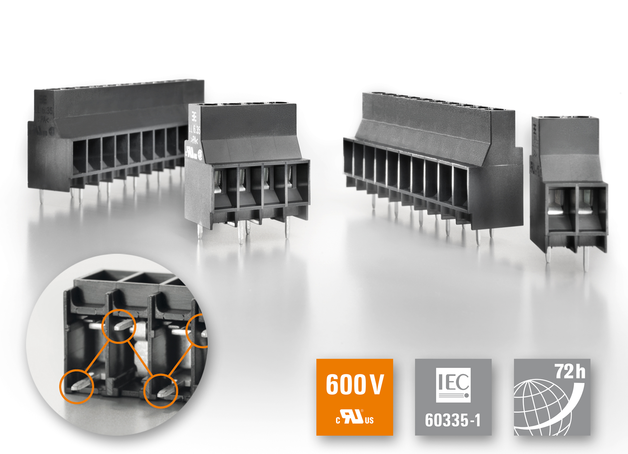 (pressebox) (Detmold, 2013-04-16) With OMNIMATE Power LL 6.35, Weidmüller presents a power terminal in 6.35 mm pitch dimension. The new high-performance PCB terminal with a tried and tested clamping yoke screw connection is suitable for wire cross-sections of 0.18 to 6 mm² (AWG 26-10). The LL 6.35 offers the smallest pitch on the market which complies with UL 1059 - 600 V (Class C) and incorporates Weidmüller's renowned high-calibre product characteristics. The power terminal for the PCB meets all approval criteria without restrictions and has a modular (2 to 12 pin), 90° conductor outlet design. The OMNIMATE Power PCB terminal LL 6.35 is also particularly safe and constructed to be extremely compact in a 6.35 mm pitch. An outstanding feature of the product are the offset solder pins: These allow the required air and creep distances to be reached for the 600-V approval in accordance with UL 1059. Manufactured from Wemid insulating material, the power terminal complies with the highest standards; Wemid is creep-resistant in accordance with CTI 600 and fire-resistant in accordance with UL 94-V0. With a continuous operation temperature of 120°C, Wemid exceeds the standard value of PA (100°C) by 20 K. Users also obtain a maintenance-free solution with proven clamping yoke connection technology for conductors up to 6 mm², since Weidmüller's clamping yoke connection system with WIRE GUARD and WIRE READY makes a vibration-resistant and maintenance-free connection. The terminal also features the globally compatible plus-minus screw, which allows for a frictional connection and can be operated with all current manual tools and power tools. The OMNIMATE Power PCB power terminal is ideally suited for connecting devices in drive technology applications, for power supplies, solar inverters and mains power filters.
