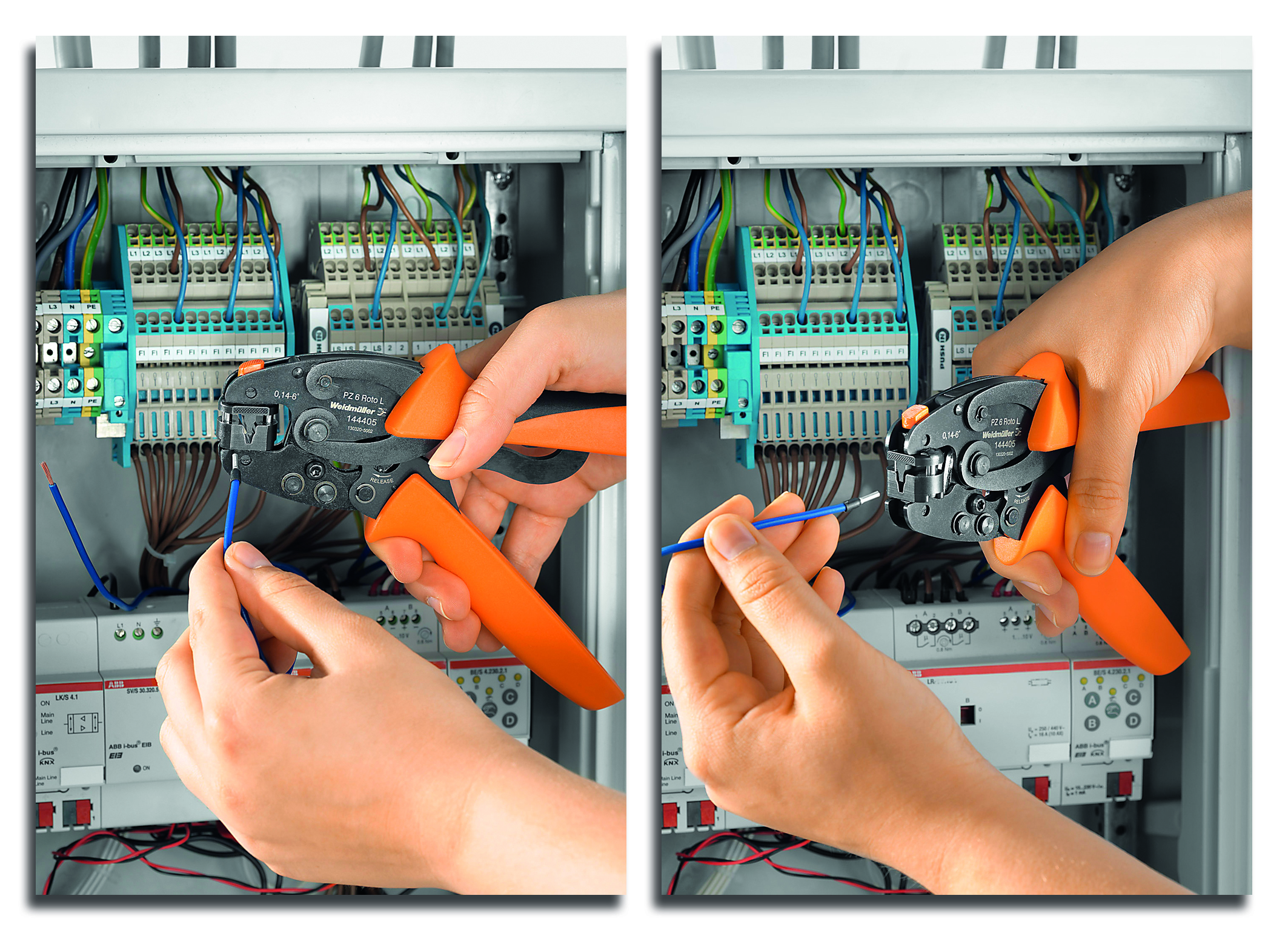 The crimping of wire-end ferrules not only requires manual dexterity, but also a suitable crimping tool and the matching contacts. The requirements of crimped connections are specified in DIN EN 60352-2. An essential quality criterion is the tensile strength achieved for the connection, as well as the avoidance of typical crimping errors. In addition to a wide range of high-quality wire-end ferrules, Weidmüller provides its new "PZ 6 Roto L" crimping tool: The quality tool impresses due to its particularly efficient and secure crimping with just one tool - it makes the work easier, even in inaccessible places or in confined cabinets. Users always achieve perfect crimping results with the "PZ 6 Roto L", as the tool adapts flexibly to a wide range of requirements. On the one hand, lines and and wire-end ferrules can be simply inserted into the tool either from the front or the side. On the other hand, the "PZ 6 Roto L" crimp insert is designed to rotate and can be locked in two positions. The fixed locking mechanisms prevent the crimp insert from being accidentally rotated during the crimping process. The user presses an orange button to rotate the crimp insert. The "PZ 6 Roto L" combines an adjustable crimp insert with a fixed locking mechanism for the very first time. The consequence of this is markedly better crimping results and variable applications.