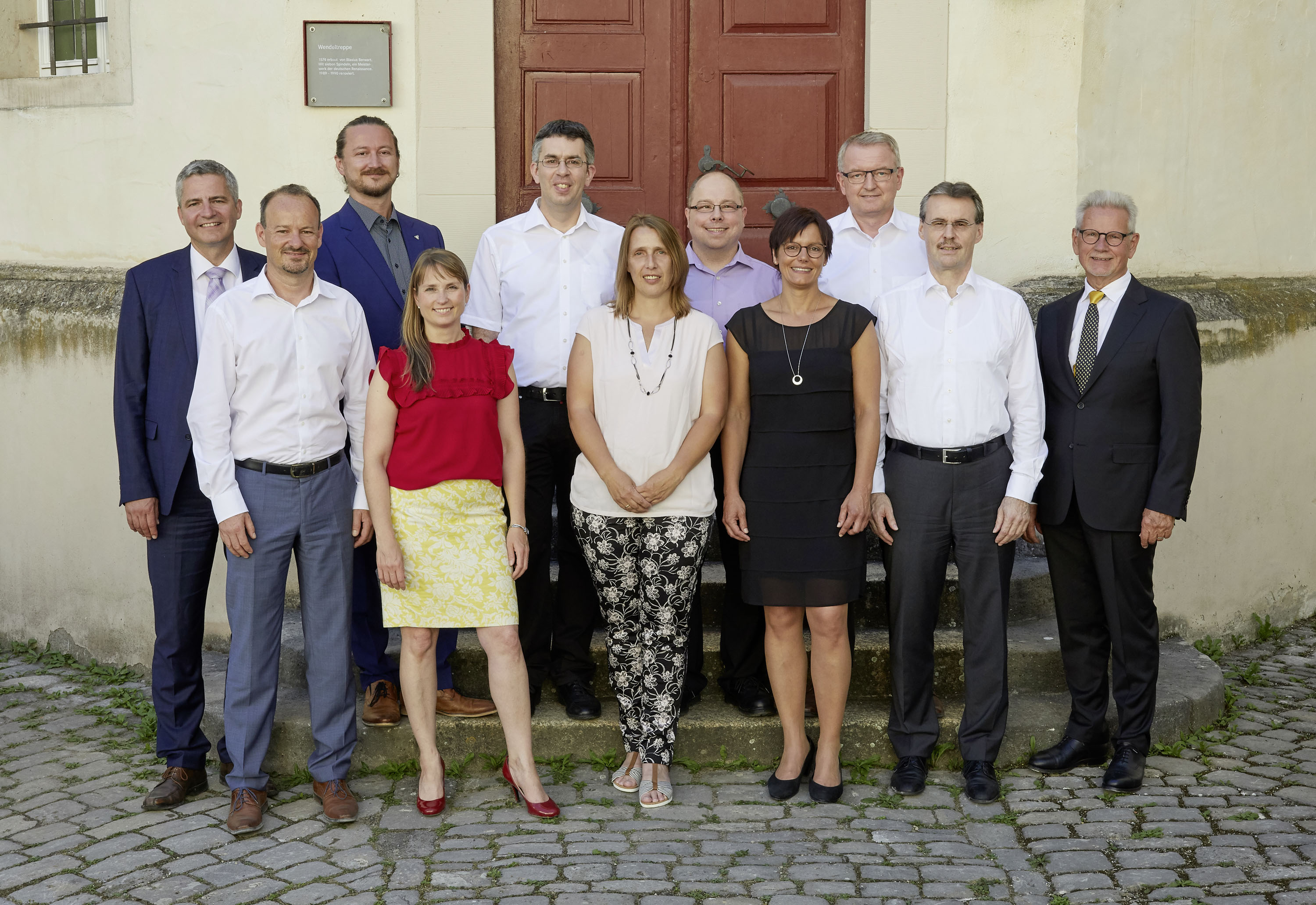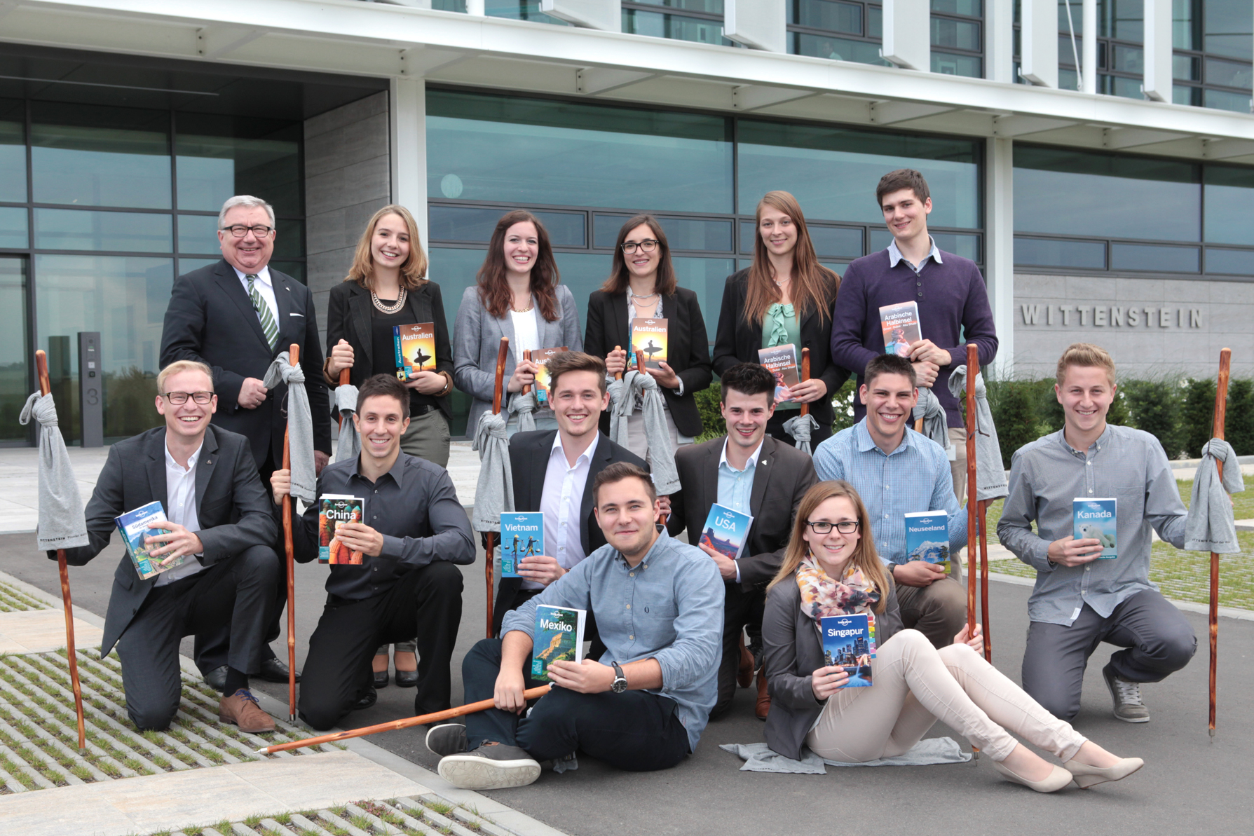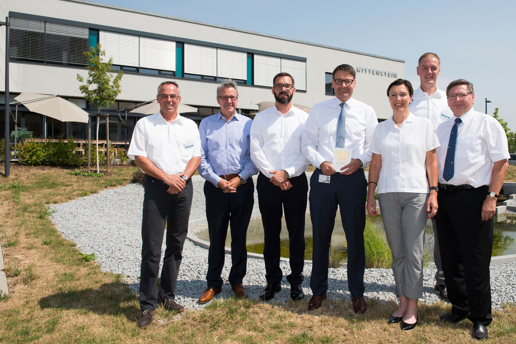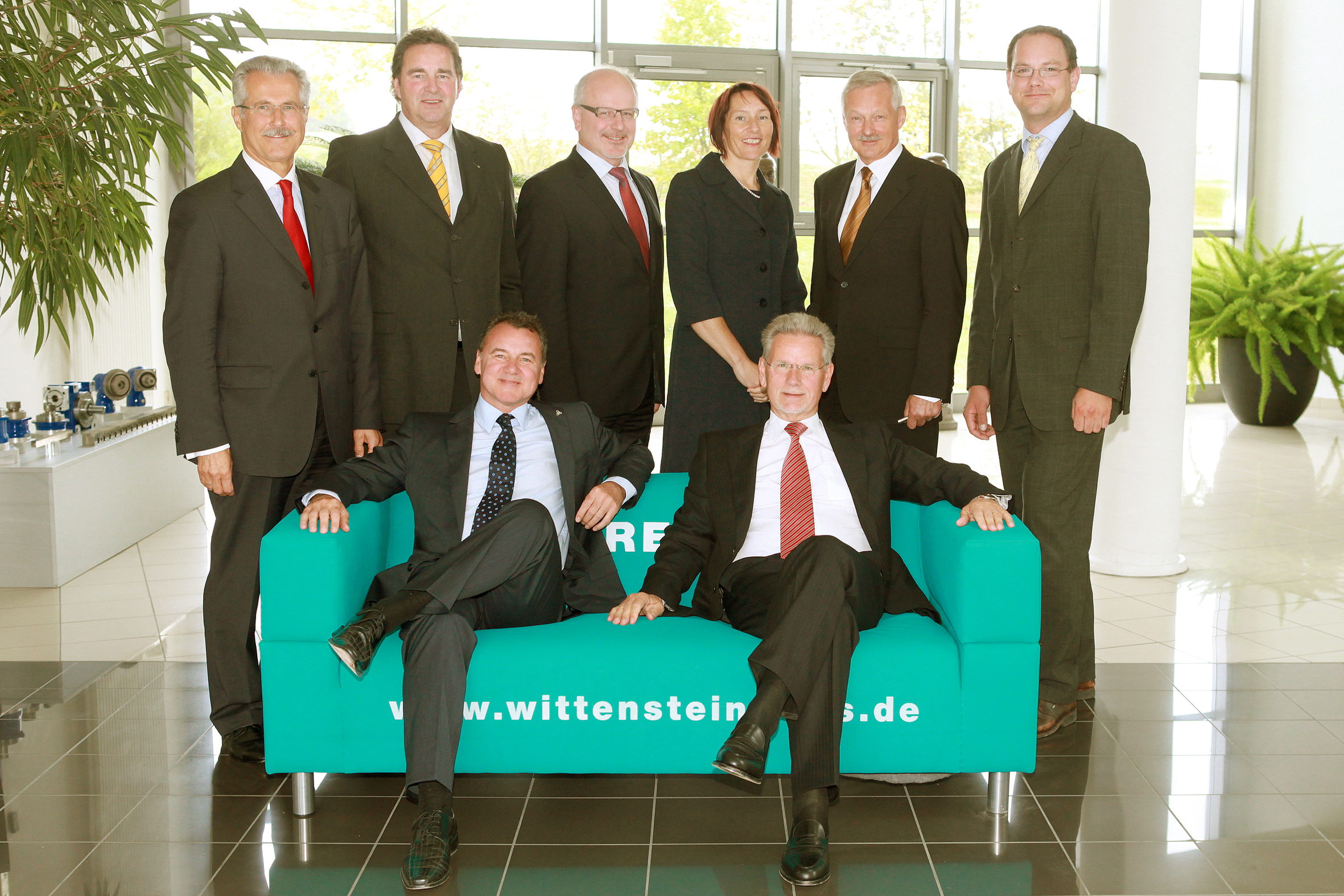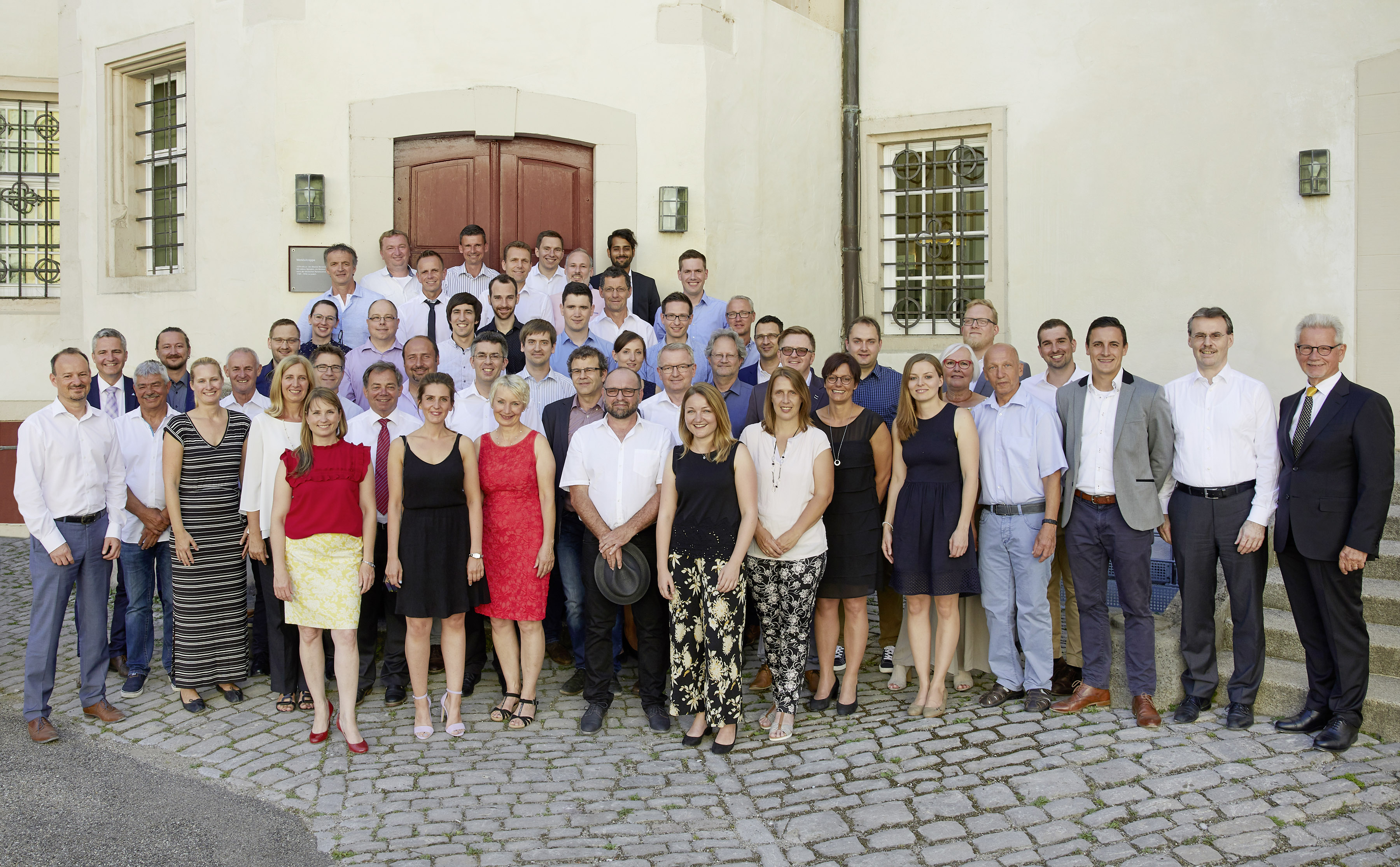 Die 25er Jubilare und Rentner der WITTENSTEIN SE gemeinsam mit dem Vorstand, dem Leiter Human Resource Management und dem Betriebsratsvorsitzenden v.l.n.r.: (Oliver Kössel, Niko Neckermann, Hermann Esau, Karl Sigloch, Ernst Kaltdorf, Klaus Hitzfelder, Reinhard Oppitz, Susanne Fries, Ulrich May, Josef Gitter, Andreas Pelz, Hartmut Kampa, Dr. Anna-Katharina Wittenstein und Erik Roßmeißl