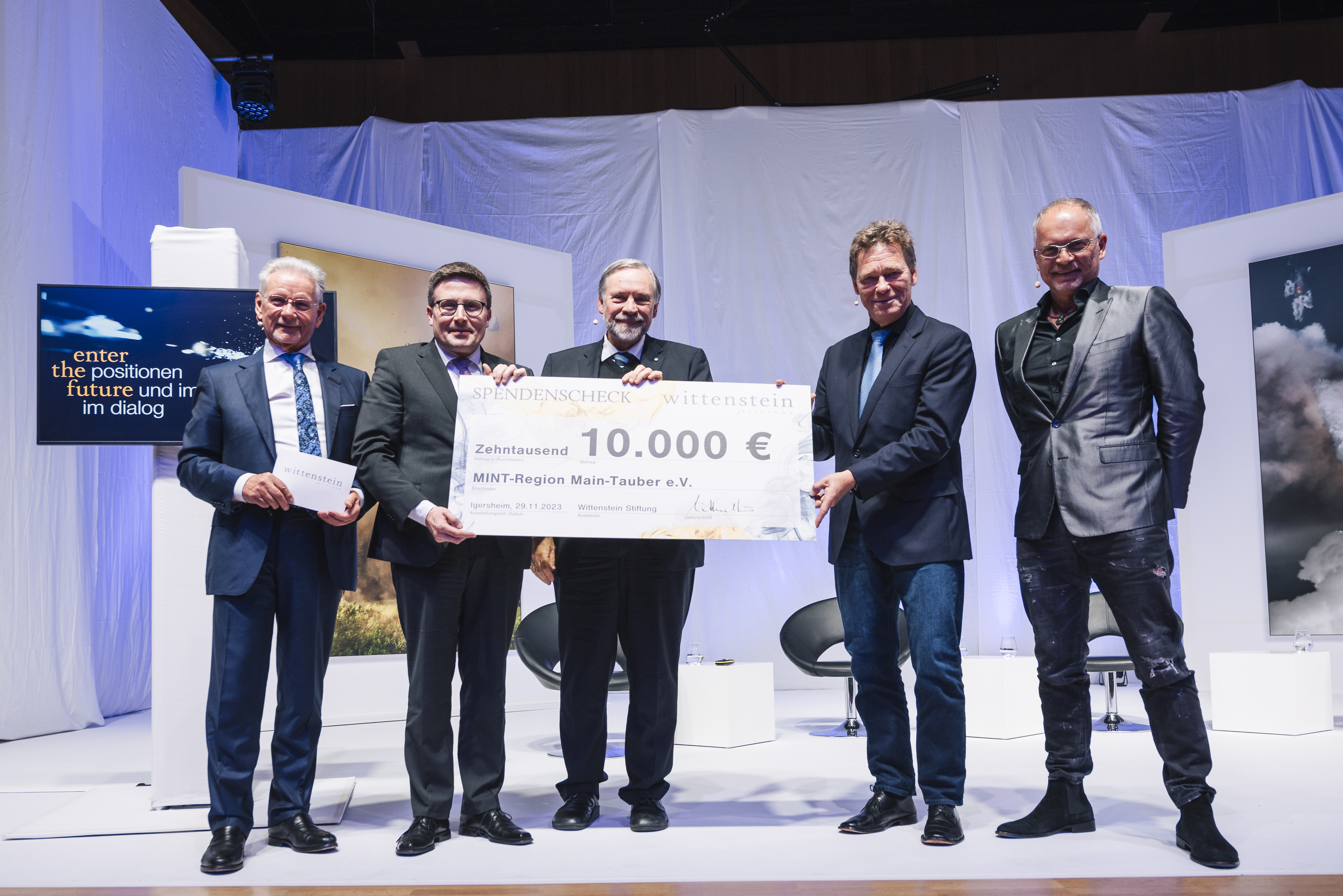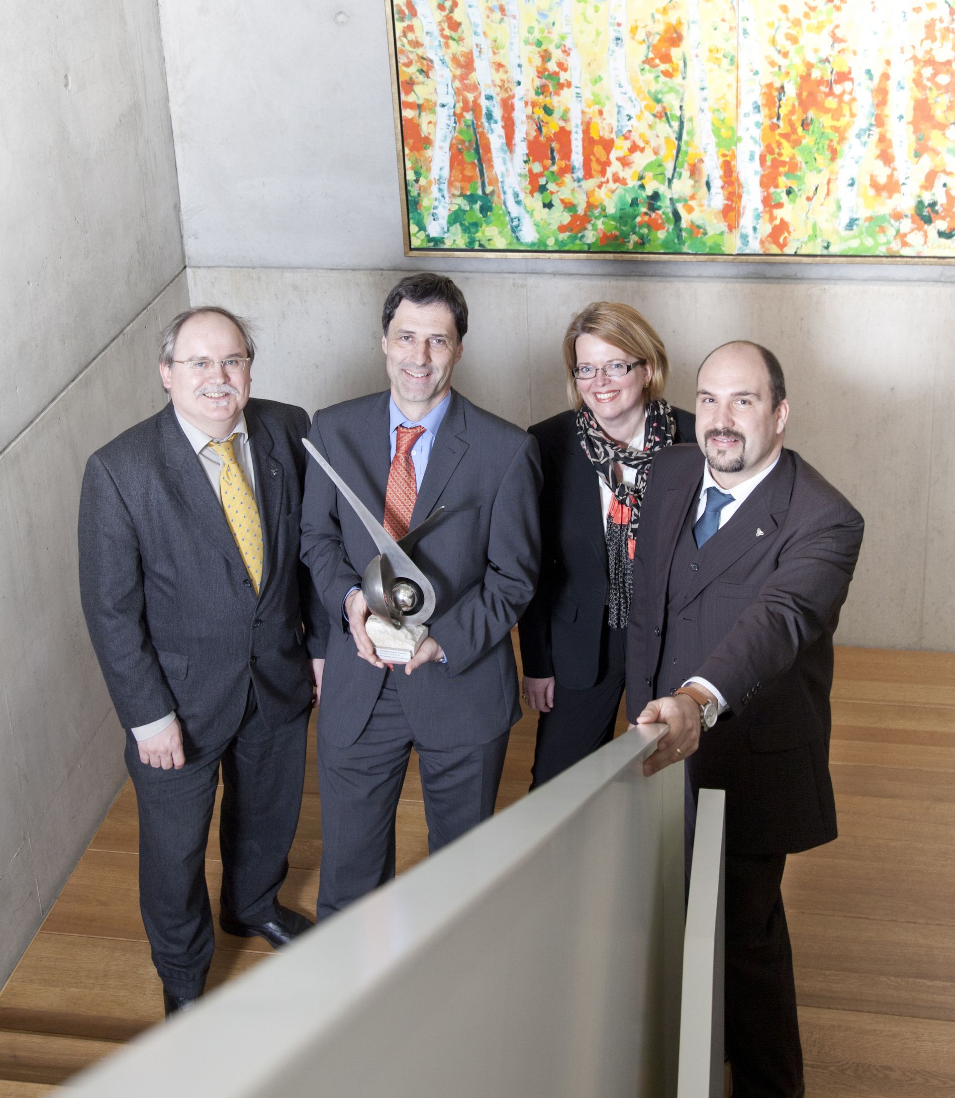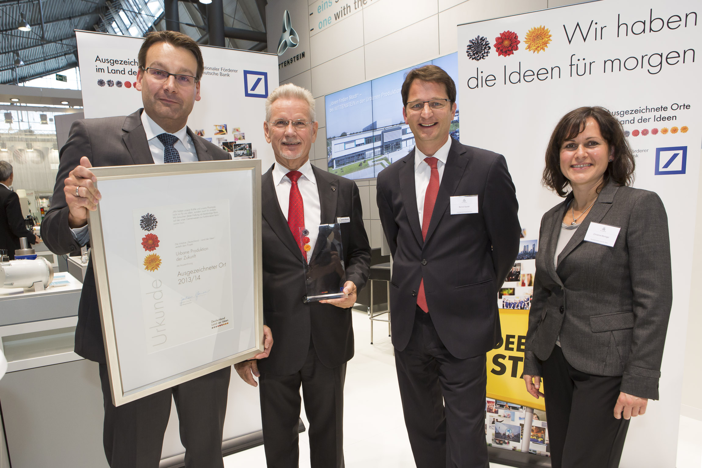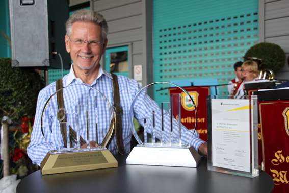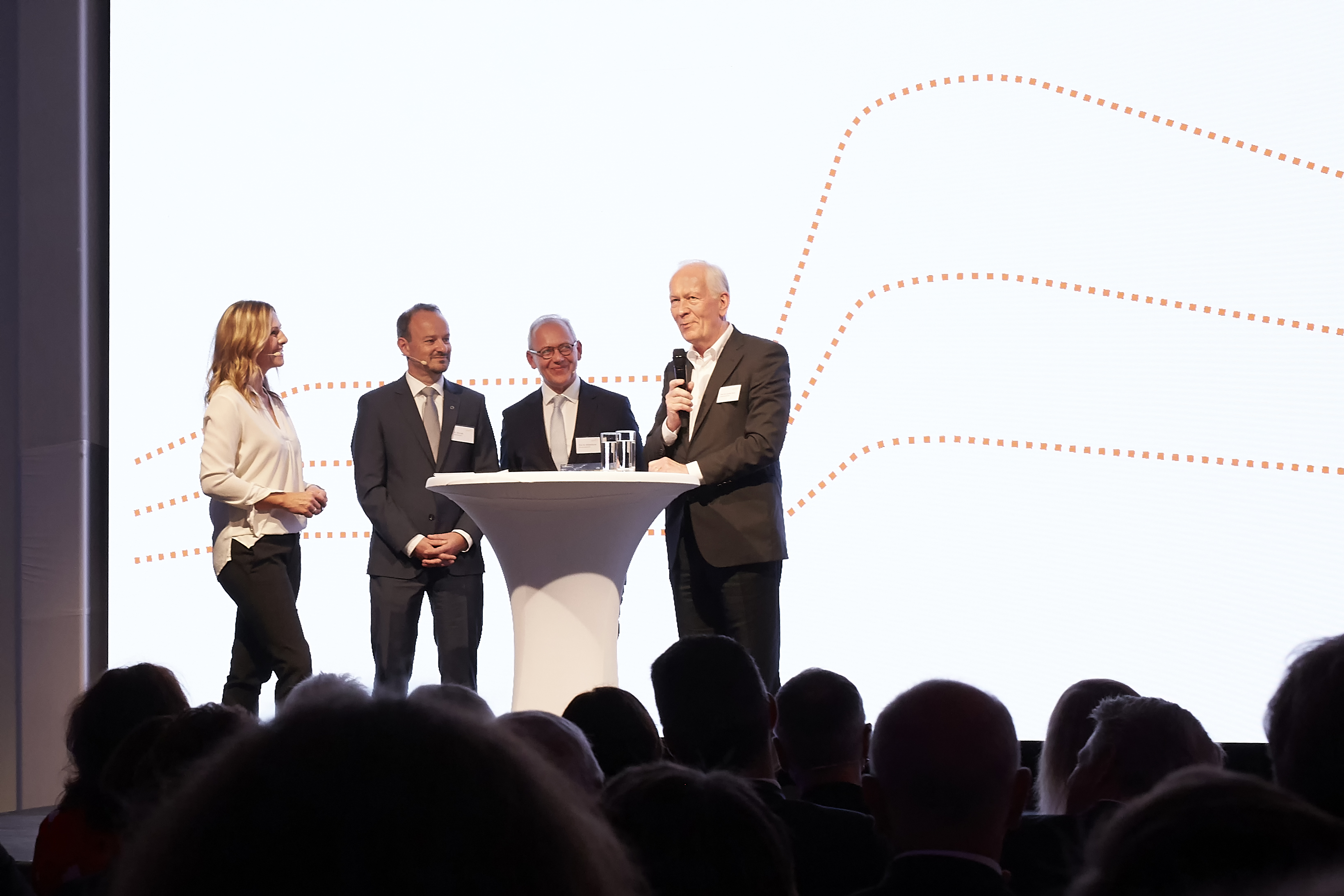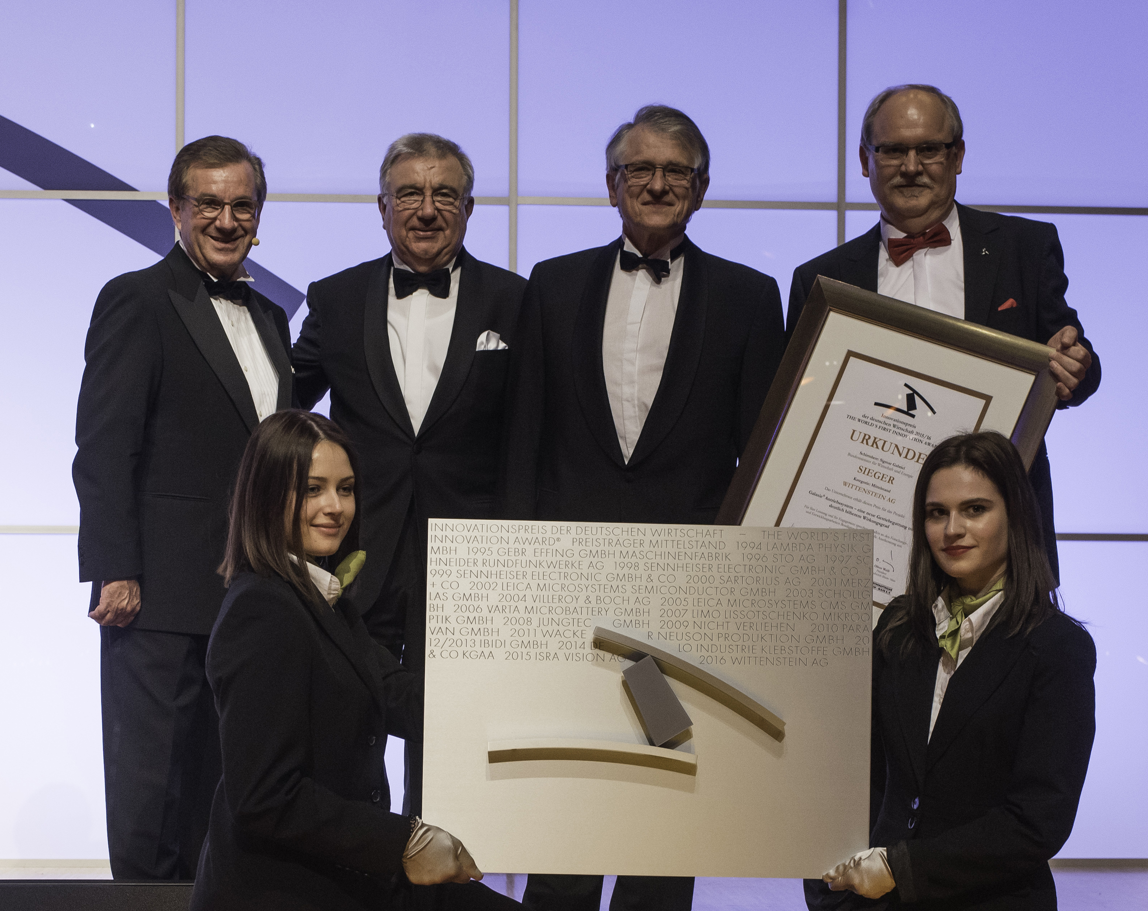 Dr. Manfred Wittenstein, Aufsichtsratsvorsitzender WITTENSTEIN SE, hat die Dieselmedaille 2019 in der Kategorie „Nachhaltigste Innovationsleistung erhalten: im Bild rechts, gemeinsam den Preisträgern der anderen drei Kategorien: Klaus Eisert (Phoenix Contact GmbH & Co. KG, "Erfolgreichste Innovationsleistung"), Martin Verg (GEOlino, Gruner + Jahr GmbH, "Beste Medienkommunikation"), Stefanie Herrmann und Thorsten Rudolph (AZO Anwendungszentrum GmbH Oberpfaffenhofen, "Beste Innovationsförderung") / Foto: Daniel Hinz, A.P.I.