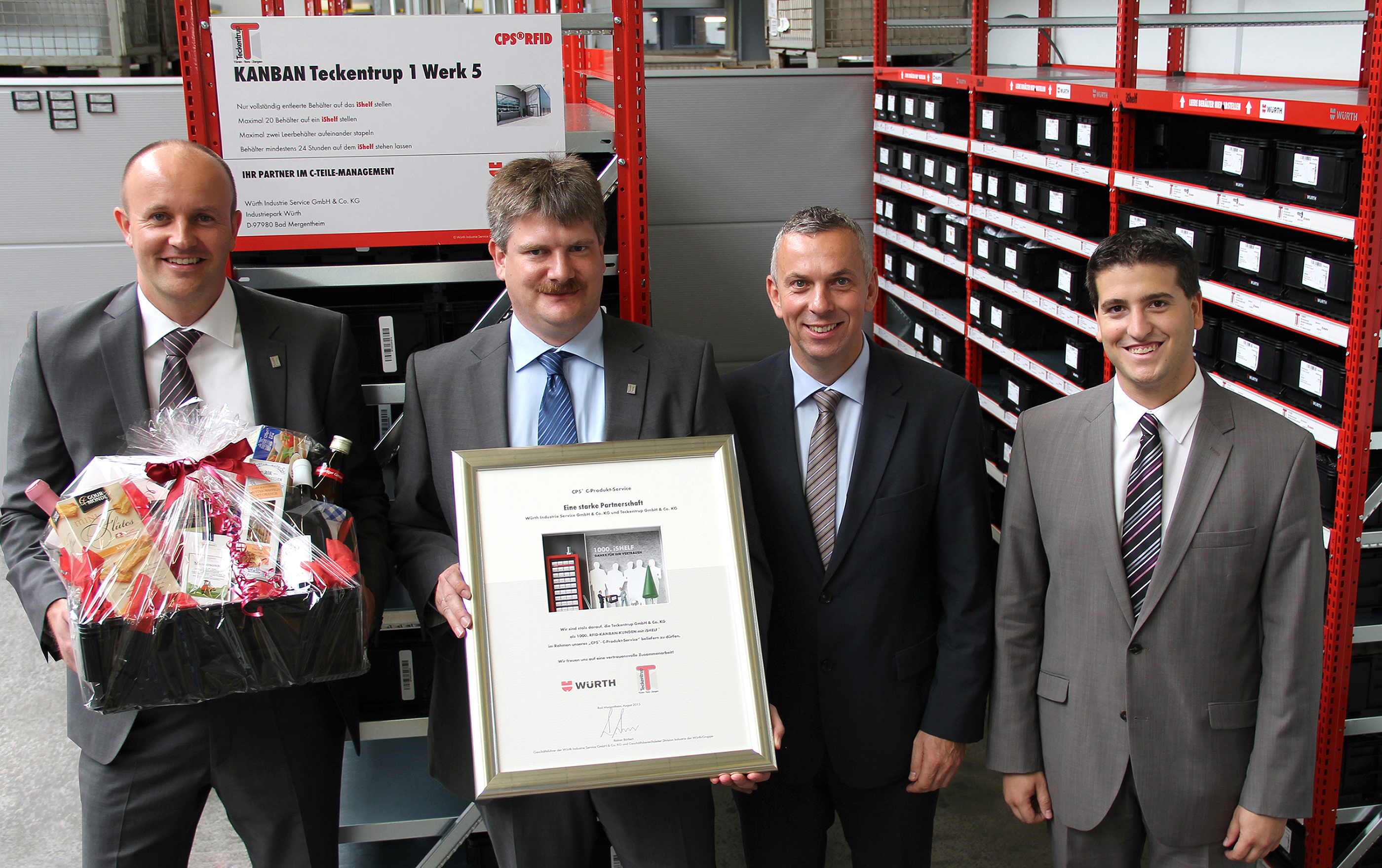 Offizielle Übergabe des 1.000. iSHELF® – v.l.n.r. Ronnie Sassenberg, Strategischer Einkauf Teckentrup, Uwe Fleischer, Einkaufsleiter Teckentrup, Jörg Ruppelt, Außendienst Würth Industrie Service, Matthias Günther, Key Account Management Würth Industrie Service