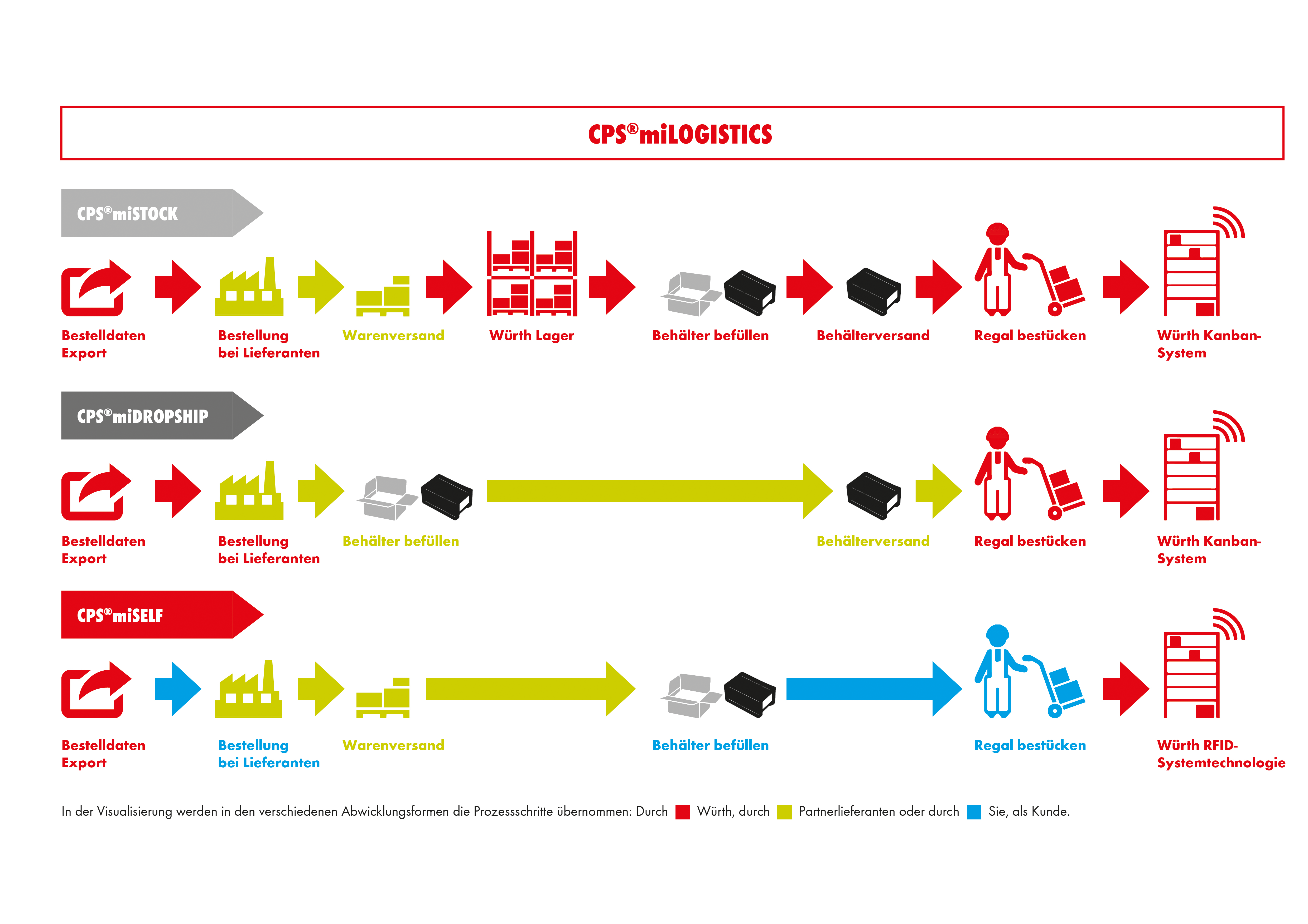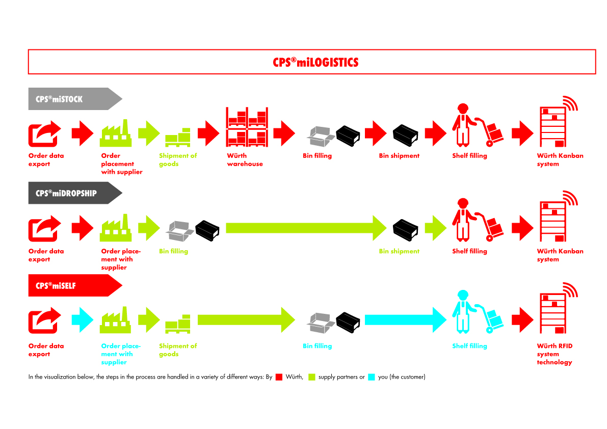 Mit CPS®miLOGISTICS nimmt Würth Industrie Service externe Lieferanten in das eigene Kanban-System auf. Kunden profitieren von einem geringeren Aufwand bei der Beschaffung und der Lieferantenverwaltung, einem ganzheitlichen Service für alle Artikel sowie Versorgungssicherheit.