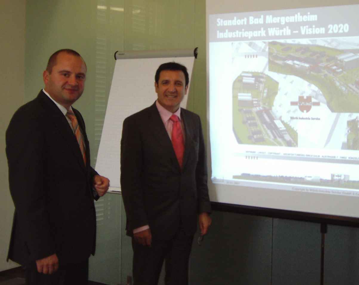 Geschäftsführer der Würth Industrie Service, Rainer Bürkert erläutert Minister Prof. Dr. Wolfgang Reinhart die "Vision 2020" des Industrieparks Würth in Bad Mergentheim.